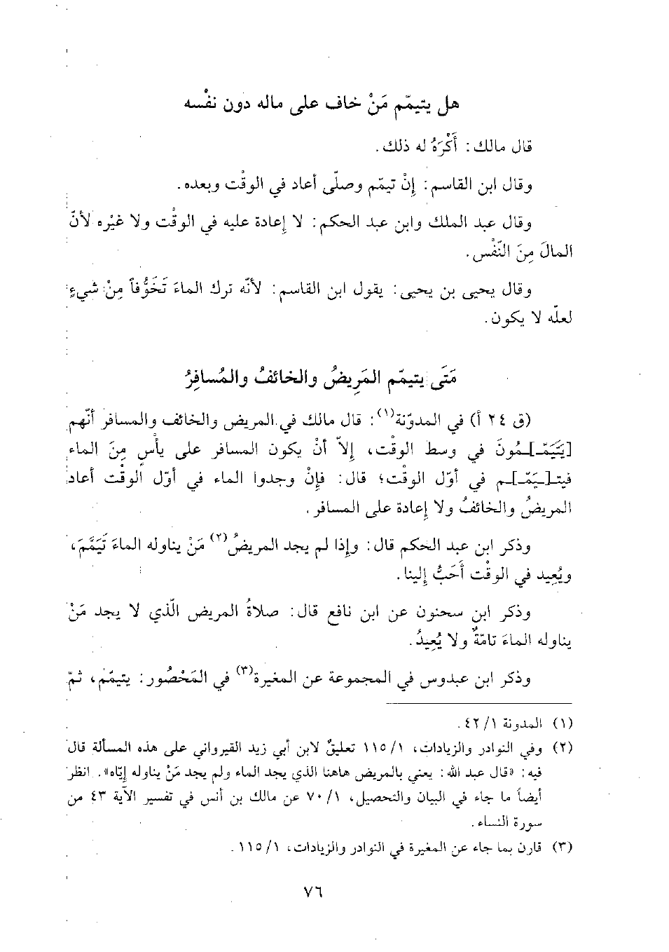 (¬2) وفي النوادر والزيادات، 1/ 115 تعليق لابن أبي زيد القيرواني على هذه المسألة قال فيه: ((قال عبد الله: يعني بالمريض هاهنا الذي يجد الماء ولم يجد من يناوله إياه)). انظر أيضا ما جاء في البيان والتحصيل، 1/ 70 عن مالك بن أنس في تفسير الآية 43 من سورة النساء.