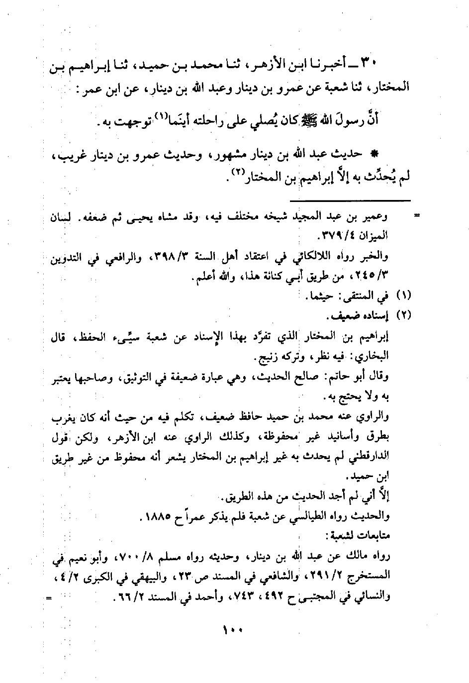 30 - أخبرنا ابن الأزهر، ثنا محمد بن حميد، ثنا إبراهيم بن المختار، ثنا شُعْبَةُ عَنْ عَمْرِو بْنِ دِينَارٍ وَعَبْدِ اللَّهِ بْنِ دِينَارٍ، عَنِ ابْنِ عُمَرَ:
