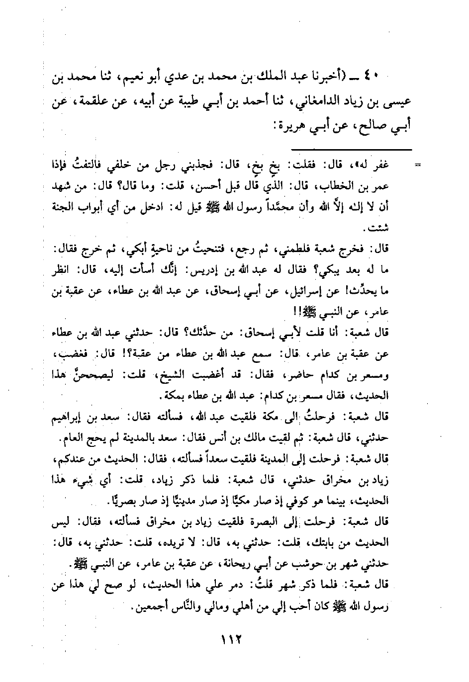40 - (أخبرنا عبد الملك بن محمد بن عدي أبو نعيم، ثنا محمد بن عيسى بن زياد الدامغاني، ثنا أحمد بن أبي طيبة عن أبيه، عن علقمة، عن أبي صالح، عن أبي هريرة: -[113]- أن أعرابياً قال: يا رسول الله أفي الجنة إبل؟