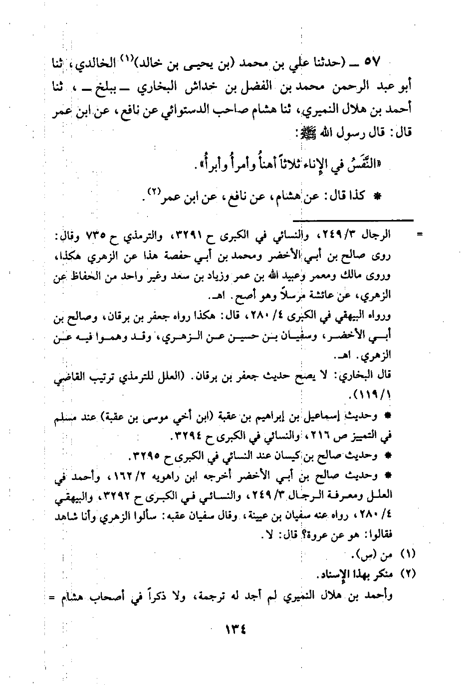 57 - (حدثنا علي بن محمد (بن يحيى بن خالد) الخالدي، ثنا أبو عبد الرحمن محمد بن الفضل بن خداش البخاري -ببلخ-، ثنا أحمد بن هلال النميري، ثنا هشام صاحب الدستوائي عن نافع، عن ابن عمر قَالَ: قَالَ رَسُولُ اللَّهِ صَلَّى اللَّهُ عَلَيْهِ وسلم: