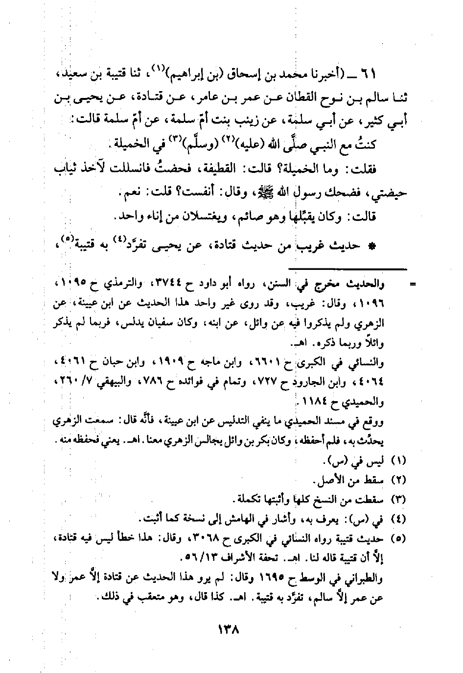 61 - (أخبرنا محمد بن إسحاق (بن إبراهيم)، ثنا قتيبة بن سعيد، ثنا سالم بن نوح القطان عن عمر بن عامر، عن قتادة، عَنْ يَحْيَى بْنِ أَبِي كَثِيرٍ، عَنْ أَبِي سلمة، عن زينب بنت أم سلمة، عن أم سلمة قالت: