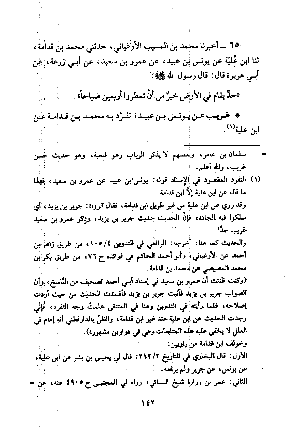 65 - أخبرنا محمد بن المسيب الأرغياني، حدثني محمد بن قدامة، ثنا ابْنُ عُلَيَّةَ عَنْ يُونُسَ بْنِ عُبَيْدٍ، عَنْ عَمْرِو بْنِ سَعِيدٍ، عَنْ أَبِي زُرْعَةَ، عَنْ أَبِي هُرَيْرَةَ قَالَ: قَالَ رَسُولُ اللَّهِ صَلَّى اللَّهُ عَلَيْهِ وَسَلَّمَ: