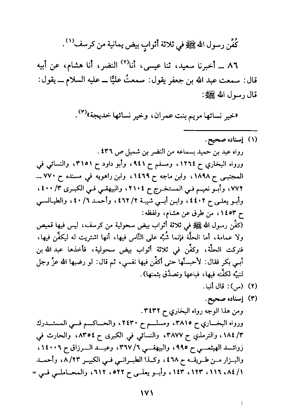 86 - أخبرنا سعيد، ثنا عيسى، أنا النضر، أنا هشام، عن أبيه قال: سمعت عبد الله بن جعفر يقول: سمعت علياً -عليه السلام- يقول: قَالَ رَسُولُ اللَّهِ صَلَّى اللَّهُ عَلَيْهِ وَسَلَّمَ: