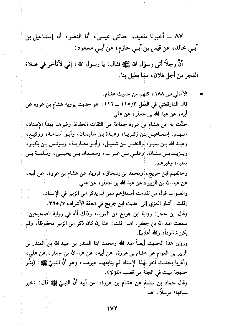 87 - أخبرنا سعيد، حدثني عيسى، أنا النضر، أنا إسماعيل بن أبي خالد، عن قيس بن أبي حازم، عن أبي مسعود:
