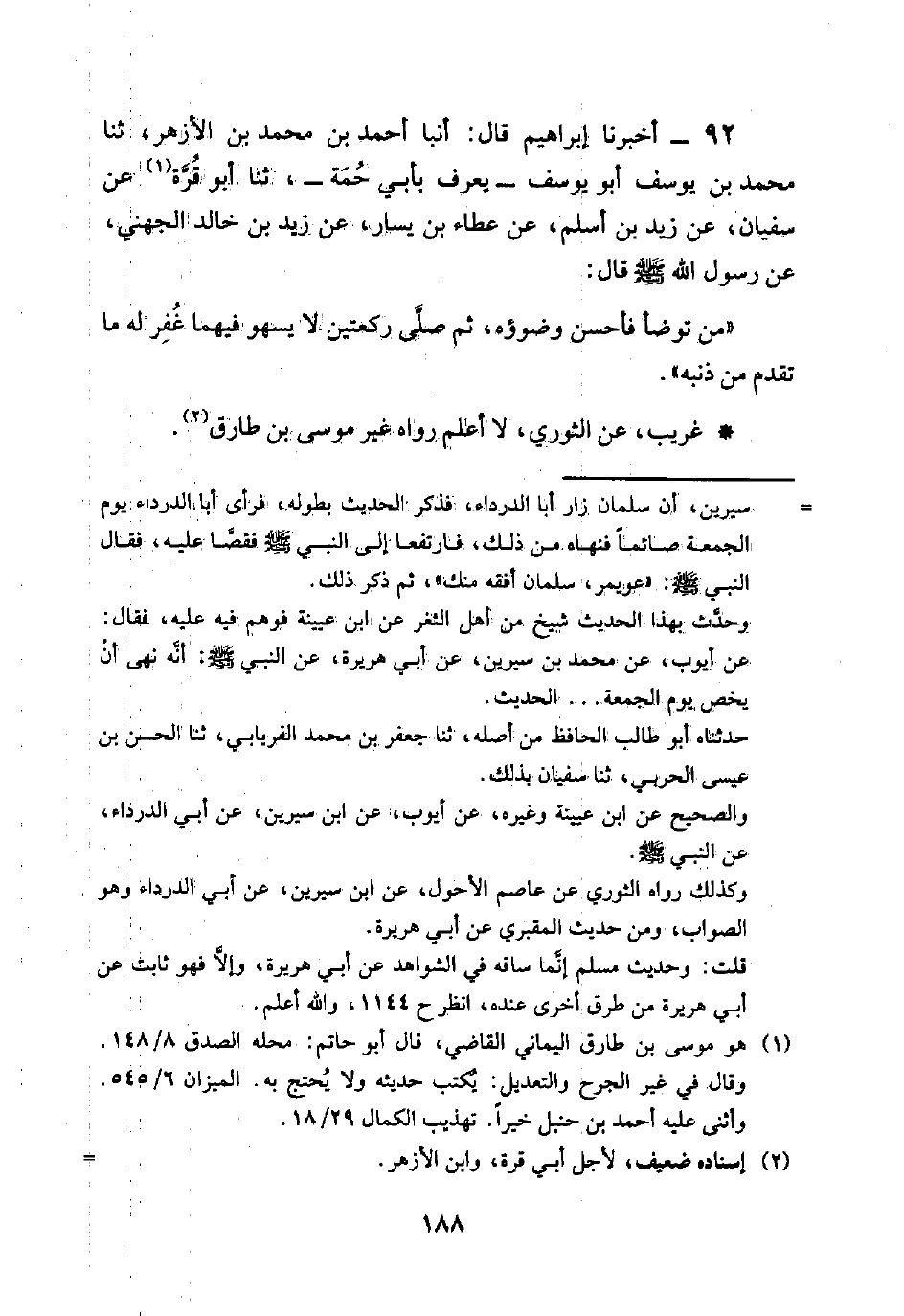92 - أخبرنا إبراهيم قال: أنبأ أحمد بن محمد بن الأزهر، ثنا محمد بن يوسف أبو يوسف -يعرف بأبي حمة-، ثنا أبو قرة عن سفيان، عن زيد بن أسلم، عن عطاء بن يسار، عن زيد بن خالد الجهني، عَنْ رَسُولِ اللَّهِ صَلَّى اللَّهُ عَلَيْهِ وَسَلَّمَ قال: