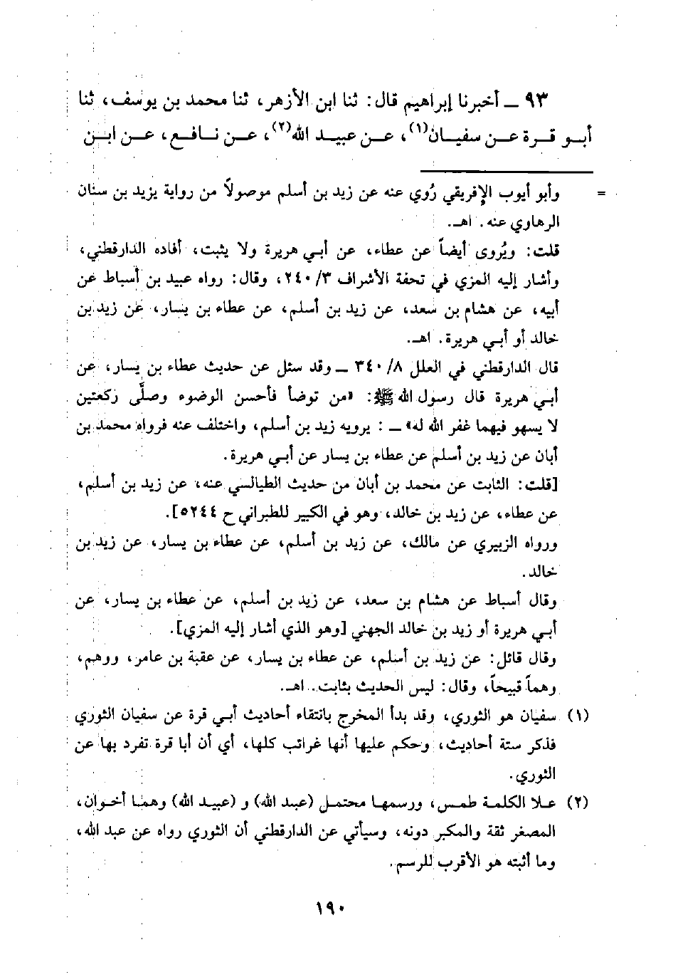 93 - أخبرنا إبراهيم قال: ثنا ابن الأزهر، ثنا محمد بن يوسف، ثنا أبو قرة عن سفيان، عن عبيد الله، عن نافع، عن ابن -[191]- حنين، عن علي قال: