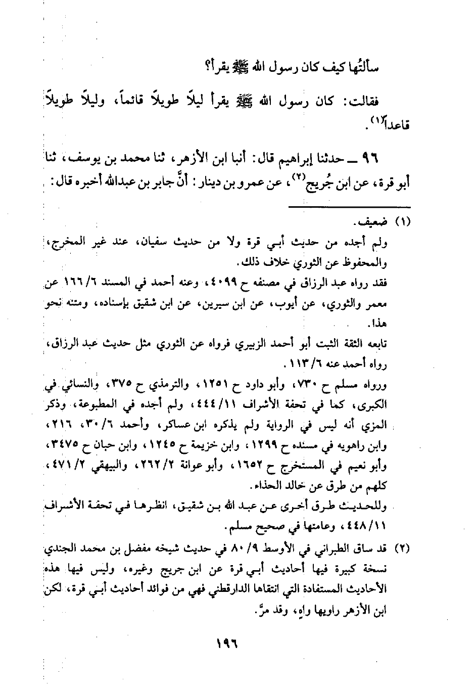 96 - حدثنا إبراهيم قال: أنبأ ابن الأزهر، ثنا محمد بن يوسف، ثنا أبو قرة، عن ابن جريج، عن عمرو بن دينار: أن جابر بن عبد الله أخبره قال: -[197]- كان معاذ بن جبل يصلي مع النبي صلى الله عليه وسلم العشاء ثم ينطلق إلى قومه فيصلي بهم، فهي له تطوع وهي لهم مكتوبة العشاء.