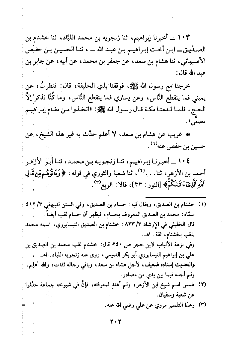 103 - أخبرنا إبراهيم، ثنا زنجويه بن محمد اللباد، ثنا خشنام بن الصديق -ابن أخت إبراهيم بن عبد الله-، ثنا الحسين بن حفص الأصبهاني، ثنا هشام بن سعد، عن جعفر بن محمد، عن أبيه، عن جابر بن عبد الله قال: