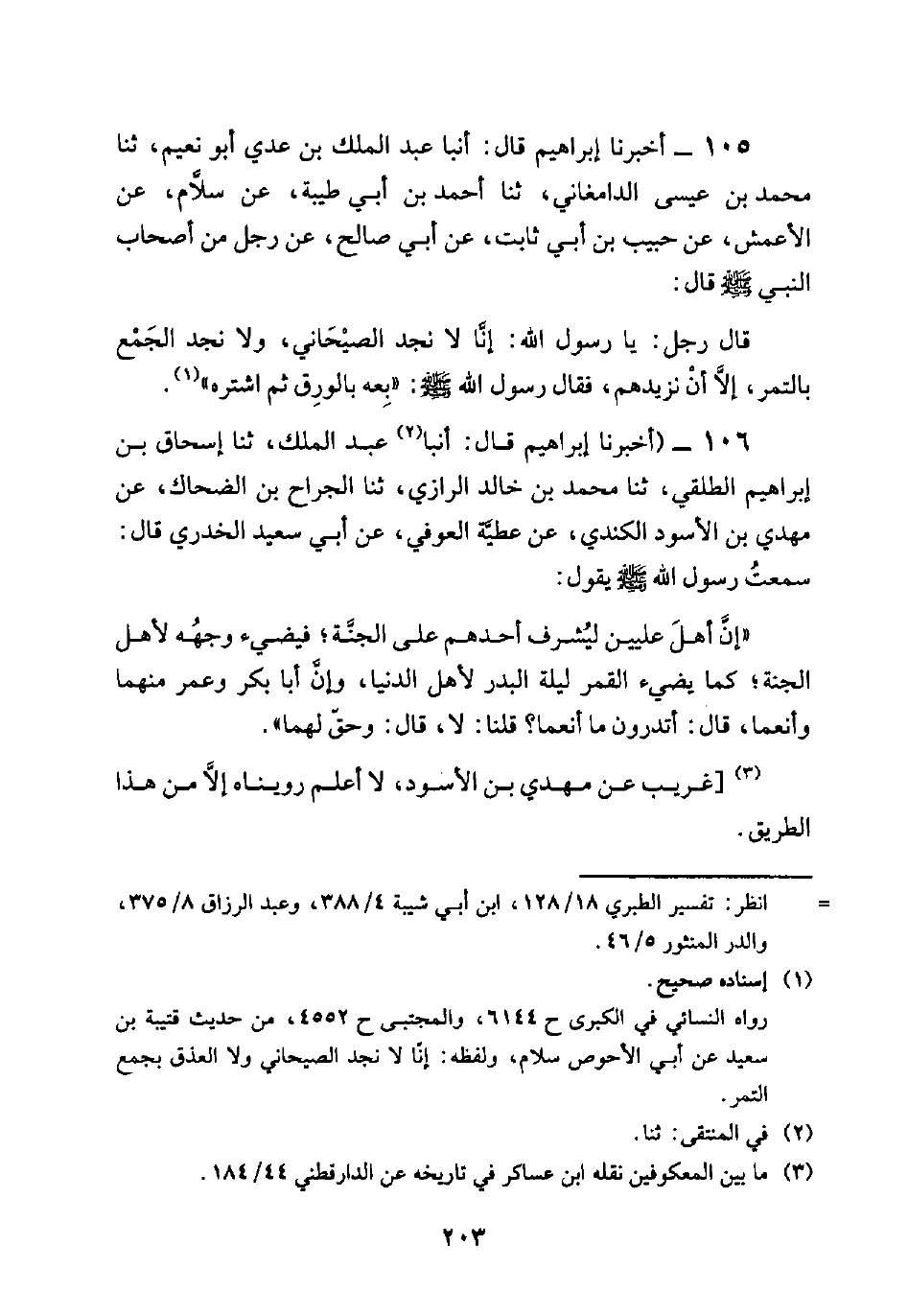 105 - أخبرنا إبراهيم قال: أنبأ عبد الملك بن عدي أبو نعيم، ثنا محمد بن عيسى الدامغاني، ثنا أحمد بن أبي طيبة، عن سلام، عن الأعمش، عن حبيب بن أبي ثابت، عن أبي صالح، عن رجل من أصحاب النبي صلى الله عليه وسلم قال: