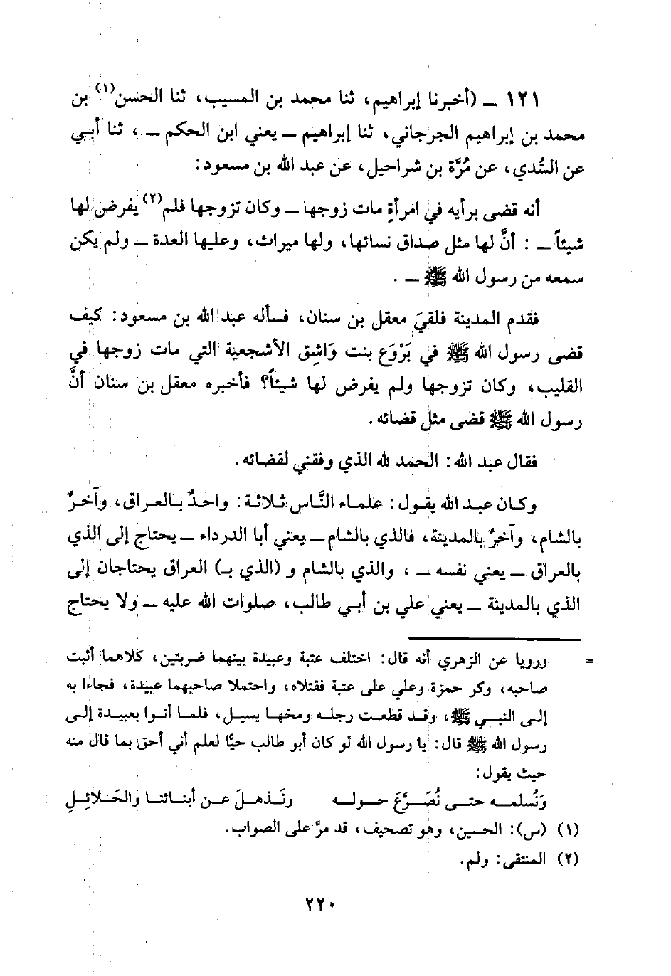 وَكَانَ عَبْدُ اللَّهِ يَقُولُ: عُلَمَاءُ النَّاسِ ثَلاثَةٌ: واحدٌ بِالْعِرَاقِ، وآخرٌ بِالشَّامِ، وآخرٌ بِالْمَدِينَةِ، فَالَّذِي بِالشَّامِ يَعْنِي أَبَا الدَّرْدَاءِ- يَحْتَاجُ إِلَى الذي بالعراق -يعني نفسه-، والذي بالشام والذي بالعراق يَحْتَاجَانِ إِلَى الَّذِي بِالْمَدِينَةِ -يَعْنِي عَلِيَّ بْنَ أَبِي طَالِبٍ، صَلَوَاتُ اللَّهِ عَلَيْهِ- وَلا يَحْتَاجُ -[221]- إلى واحد منهما).