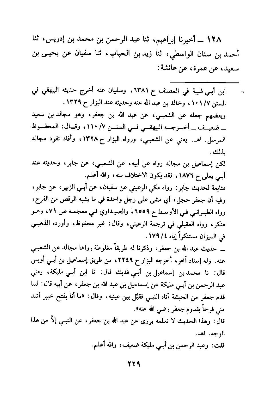 128 - أخبرنا إبراهيم، ثنا عبد الرحمن بن محمد بن إدريس، ثنا أحمد بن سنان الواسطي، ثنا زيد بن الحباب، ثنا سفيان عَنْ يَحْيَى بْنِ سَعِيدٍ، عَنْ عَمْرَةَ، عَنْ عَائِشَةَ: -[230]- أَنّ النَّبِيَّ صَلَّى اللَّهُ عَلَيْهِ وَسَلَّمَ دخل على عائشة وعندها امرأة ترقيها من النملة، فقال: ((ارقيها بكتاب الله عز وجل)).