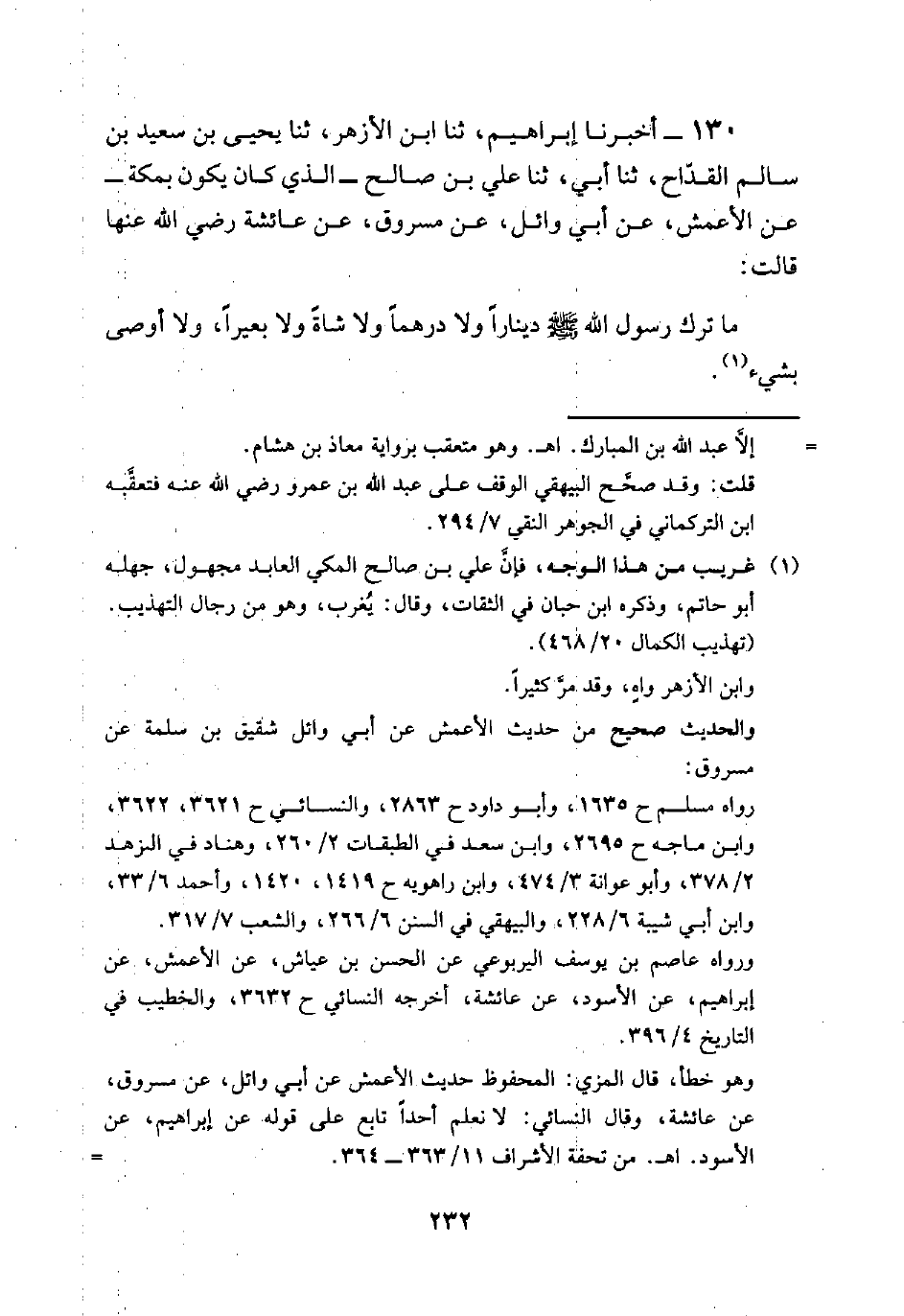130 - أخبرنا إبراهيم، ثنا ابن الأزهر، ثنا يحيى بن سعيد بن سالم القداح، ثنا أبي، ثنا علي بن صالح -الذي كان يكون بمكة- عن الأعمش، عن أبي وائل، عَنْ مَسْرُوقٍ، عَنْ عَائِشَةَ رَضِيَ اللَّهُ عَنْهُا قالت: