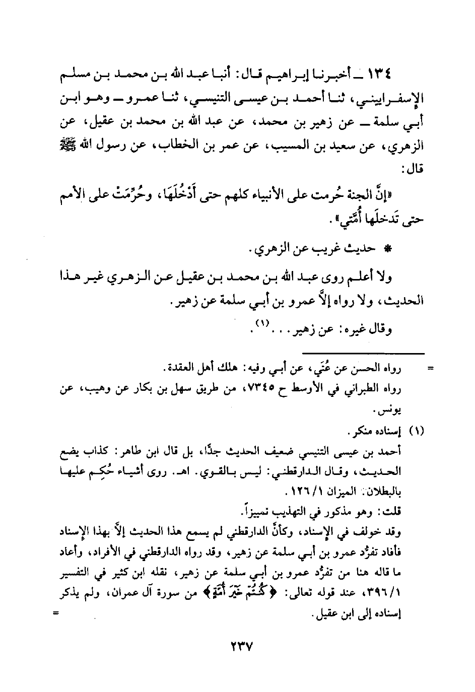 134 - أخبرنا إبراهيم قال: أنبأ عَبْدُ اللَّهِ بْنُ مُحَمَّدِ بْنِ مُسْلِمٍ الإِسْفَرَايِينِي، ثنا أحمد بن عيسى التنيسي، ثنا عمرو وهو ابن أبي سلمة- عن زهير بن محمد، عن عبد الله بن محمد بن عقيل، عن الزهري، عن سعيد بن المسيب، عن عمر بن الخطاب، عَنْ رَسُولِ اللَّهِ صَلَّى اللَّهُ عَلَيْهِ وَسَلَّمَ قال: