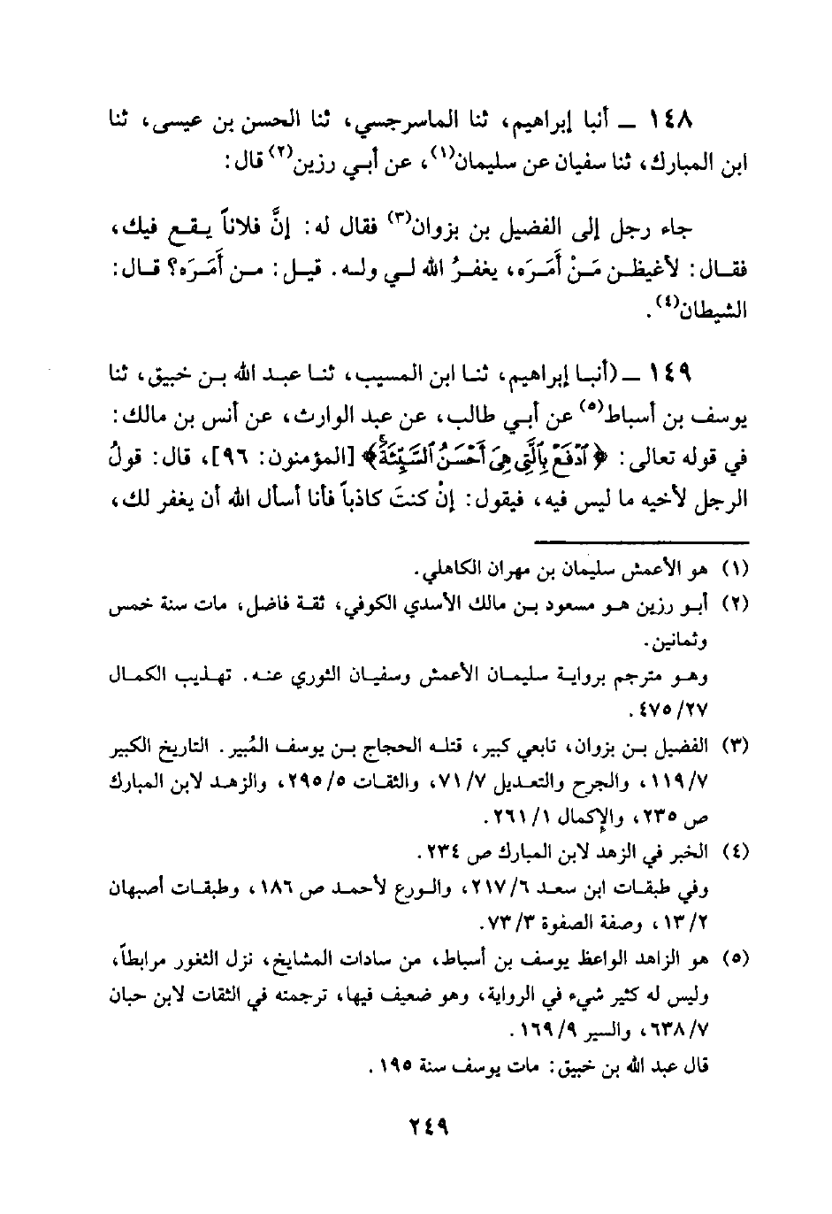 149 - (أنبأ إبراهيم، ثنا ابن المسيب، ثنا عبد الله بن خبيق، ثنا يُوسُفُ بْنُ أَسْبَاطٍ عَنْ أَبِي طَالِبٍ، عَنْ عَبْدِ الْوَارِثِ، عَنْ أَنَسِ بْنِ مَالِكٍ: فِي قَوْلِهِ تَعَالَى: {ادْفَعْ بِالَّتِي هِيَ أَحْسَنُ السيئة}، قَالَ: قَوْلُ الرَّجُلِ لأَخِيهِ مَا لَيْسَ فِيهِ، فَيَقُولُ: إِنْ كُنْتَ كَاذِبًا فَأَنَا أَسْأَلُ اللَّهَ أَنْ يَغْفِرَ لَكَ، -[250]- وَإِنْ كُنْتَ صَادِقًا فَأَنَا أسأل الله أن يغفر لي).
