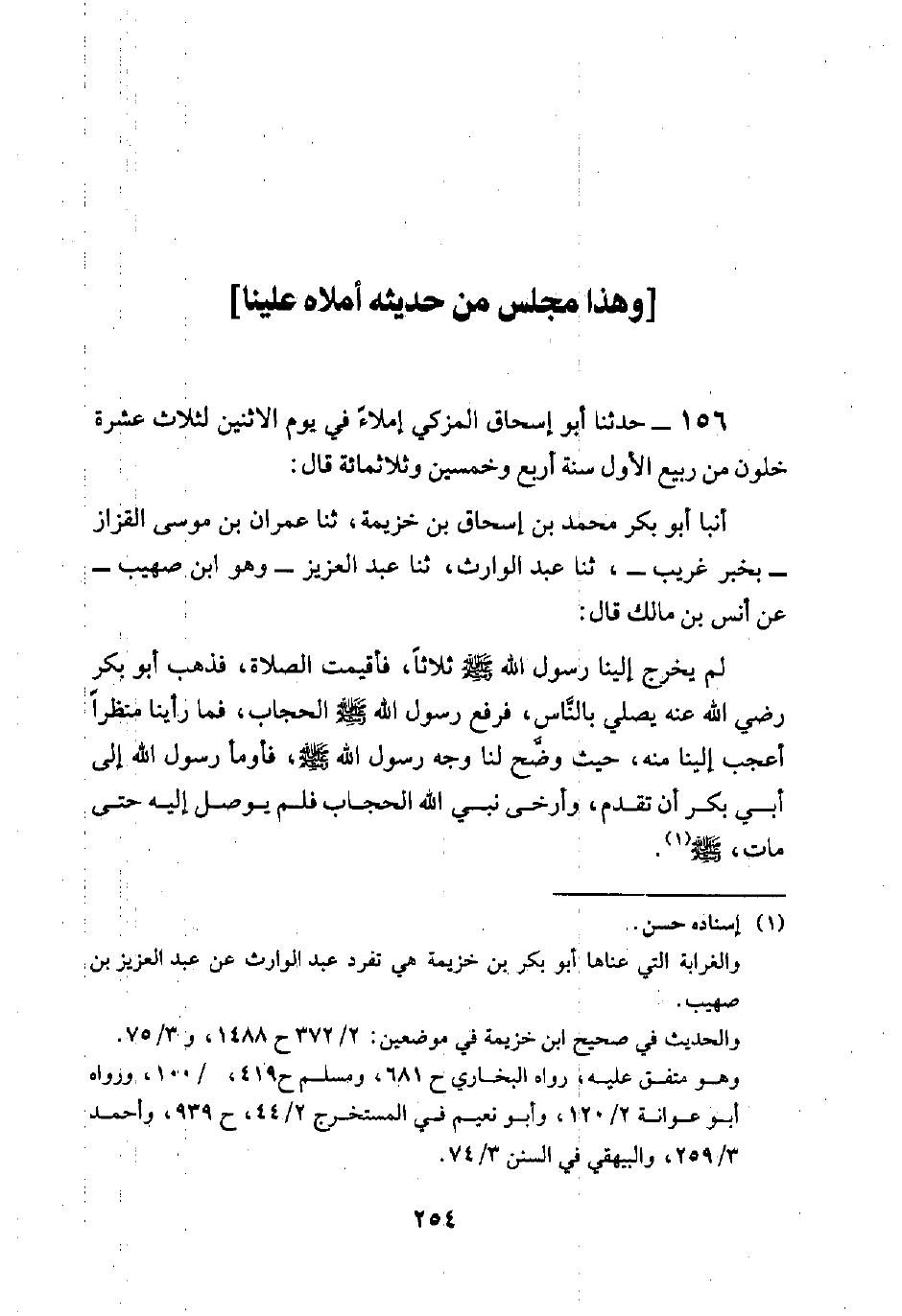 أنبأ أَبُو بَكْرٍ مُحَمَّدُ بْنُ إِسْحَاقَ بْنِ خُزَيْمَةَ، ثنا عمران بن موسى القزاز -بخبر غريب-، ثنا عبد الوارث، ثنا عَبْدُ الْعَزِيزِ -وَهُوَ ابْنُ صُهَيْبٍ- عَنْ أَنَسِ بْنِ مَالِكٍ قَالَ: