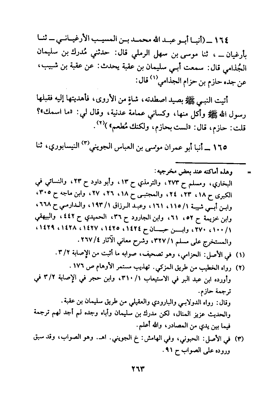 164 - (أنبأ أَبُو عَبْدِ اللَّهِ مُحَمَّدُ بْنُ الْمُسَيِّبِ الأَرْغِيَانِيُّ -ثنا بأرغيان-، ثنا مُوسَى بْنُ سَهْلٍ الرَّمْلِيُّ قَالَ: حَدَّثَنِي مدرك بن سلمان الْجُذَامِيُّ قَالَ: سَمِعْتُ أَبِي سُلَيْمَانَ بْنَ عُقْبَةَ يُحَدِّثُ: عَنْ عُقْبَةَ بْنِ شَبِيبٍ، عَنْ جَدِّهِ حَازِمِ بْنِ حِزَامٍ الْجُذَامِيِّ قَالَ: