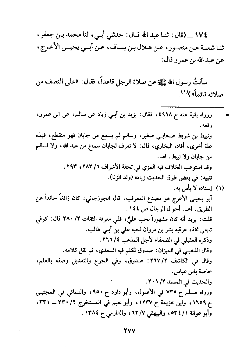 174 - (قَالَ: ثنا عَبْدُ اللَّهِ قَالَ: حَدَّثَنِي أَبِي، ثنا محمد بن جعفر، ثنا شُعْبَةُ عَنْ مَنْصُورٍ، عَنْ هِلالِ بْنِ يَسَافٍ، عَنْ أَبِي يَحْيَى الأَعْرَجِ، عَنْ عَبْدِ اللَّهِ بْنِ عَمْرٍو قَالَ: