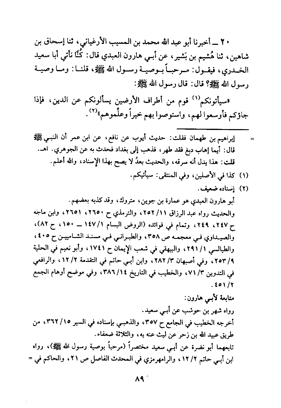 20 - أخبرنا أَبُو عَبْدِ اللَّهِ مُحَمَّدُ بْنُ الْمُسَيِّبِ الأَرْغِيَانِيُّ، ثنا إسحاق بن شاهين، ثنا هُشَيْمُ بْنُ بَشِيرٍ، عَنْ أَبِي هَارُونَ الْعَبْدِيِّ قَالَ: كُنَّا نَأْتِي أَبَا سَعِيدٍ الْخُدْرِيَّ، فَيَقُولُ: مَرْحَبًا بِوَصِيَّةِ رَسُولِ اللَّهِ صَلَّى اللَّهُ عَلَيْهِ وَسَلَّمَ، قُلْنَا: وَمَا وَصِيَّةُ رَسُولِ اللَّهِ صَلَّى اللَّهُ عَلَيْهِ وَسَلَّمَ؟ قَالَ رَسُولُ اللَّهِ صَلَّى اللَّهُ عَلَيْهِ وَسَلَّمَ: