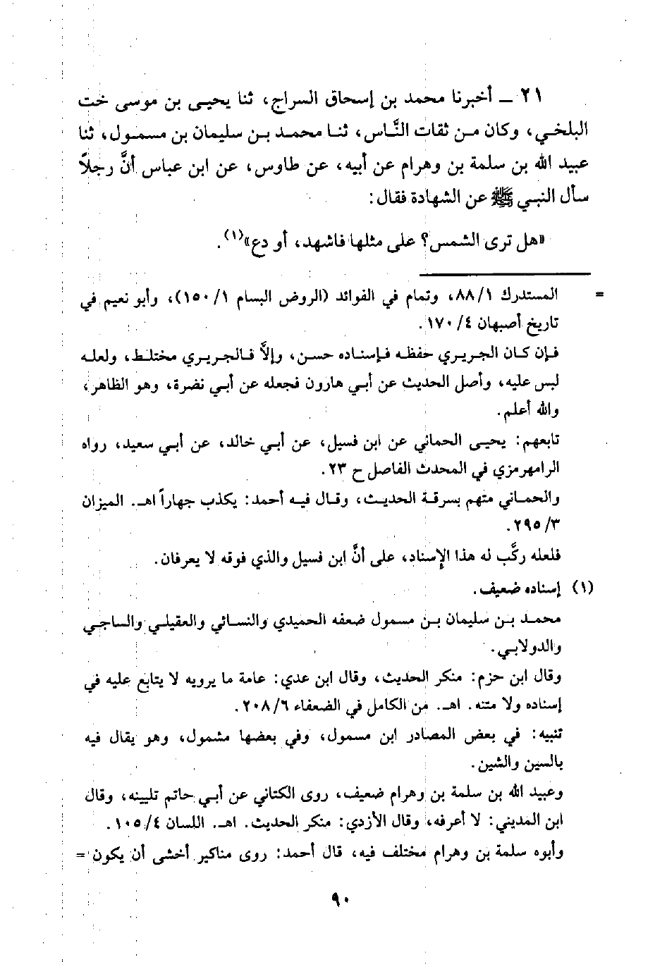 21 - أخبرنا محمد بن إسحاق السراج، ثنا يَحْيَى بْنُ مُوسَى خَتٌّ الْبَلْخِيُّ، وَكَانَ من ثقات الناس، ثنا محمد بن سليمان بن مسمول، ثنا عُبَيْدُ اللَّهِ بْنُ سَلَمَةَ بْنِ وَهْرَامٍ عَنْ أَبِيهِ، عَنْ طَاوُسٍ، عَنِ ابْنِ عَبَّاسٍ أَنَّ رَجُلا سَأَلَ النَّبِيَّ صَلَّى اللَّهُ عَلَيْهِ وَسَلَّمَ عَنِ الشَّهَادَةِ فَقَالَ: