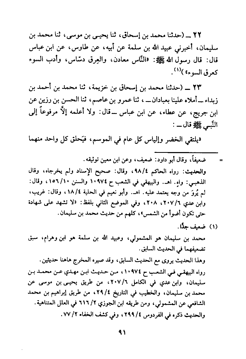 22 - (حدثنا محمد بن إسحاق، ثنا يحيى بن موسى، ثنا محمد بن سليمان، أخبرني عبيد الله بن سلمة عَنْ أَبِيهِ، عَنْ طَاوُسٍ، عَنِ ابْنِ عَبَّاسٍ قَالَ: قَالَ رَسُولُ اللَّهِ صَلَّى اللَّهُ عَلَيْهِ وسلم: ((الناس معادن، والعرق دساس، وأدب السوء كعرق السوء))).