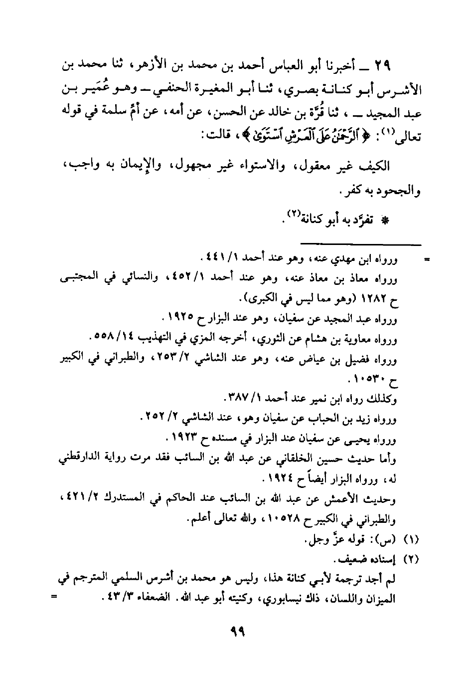 29 - أخبرنا أَبُو الْعَبَّاسِ أَحْمَدُ بْنُ مُحَمَّدِ بْنِ الأَزْهَرِ، ثنا مُحَمَّدُ بْنُ الأَشْرَسِ أَبُو كِنَانَةَ بَصْرِيٌّ، ثنا أَبُو الْمُغِيرَةِ الْحَنَفِيُّ -وَهُوَ عُمَيْرُ بْنُ عبد المجيد- ثنا قُرَّةُ بْنُ خَالِدٍ عَنِ الْحَسَنِ، عَنْ أُمِّهِ، عَنْ أُمِّ سَلَمَةَ فِي قَوْلِهِ تَعَالَى: {الرحمن على العرش استوى}، قَالَتْ: