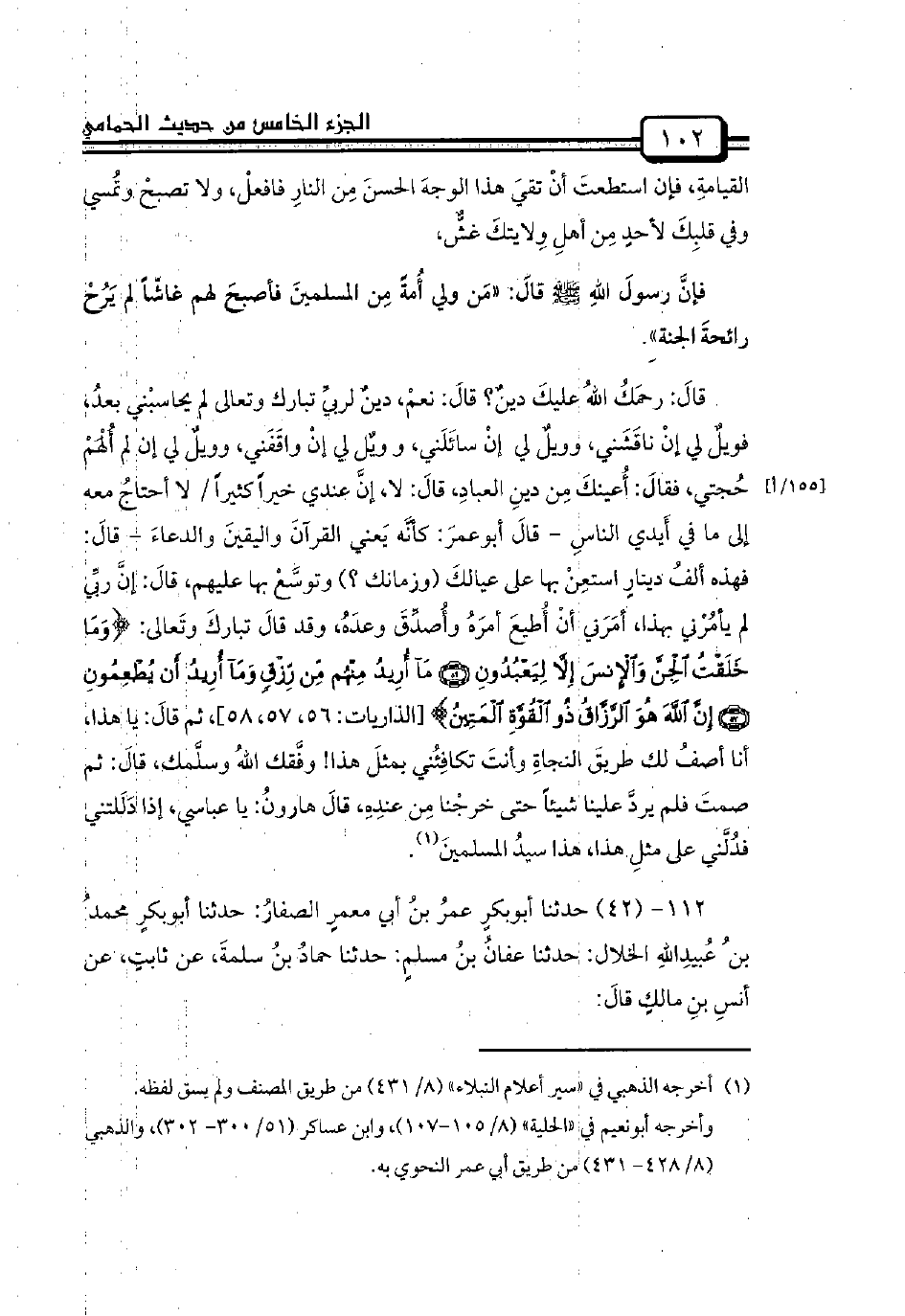 112 - (42) حدثنا أبوبكرٍ عمرُ بنُ أبي معمرٍ الصفارُ: حدثنا أبوبكرٍ محمد ُ بن ُ عُبيدِاللهِ الخلال: حدثنا عفانُ بنُ مسلمٍ: حدثنا حمادُ بنُ سلمةَ، عن ثابتٍ، عن أنسِ بنِ مالكٍ قالَ:
