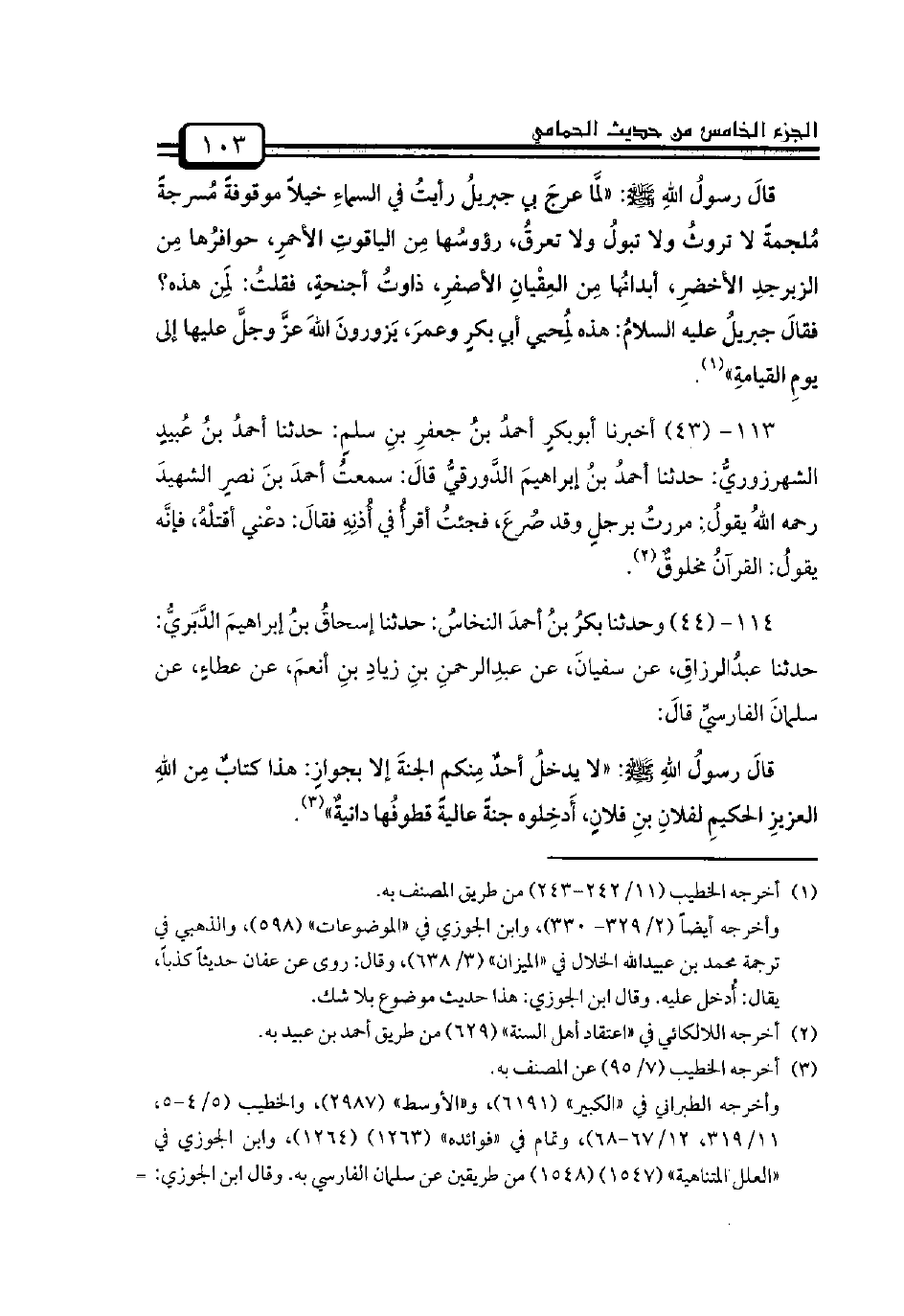 113 - (43) أخبرنا أبوبكرٍ أحمدُ بنُ جعفرِ بنِ سلمٍ: حدثنا أحمدُ بنُ عُبيدٍ الشهرزوريُّ: حدثنا أحمدُ بنُ إبراهيمَ الدَّورقيُّ قالَ: سمعتُ أحمدَ بنَ نصرٍ الشهيدَ رحمه اللهُ يقولُ: مررتُ برجلٍ وقد صُرعَ، فجئتُ أقرأُ في أُذنِهِ فقالَ: دعْني أقتلْهُ، فإنَّه يقولُ: القرآنُ مخلوقٌ.