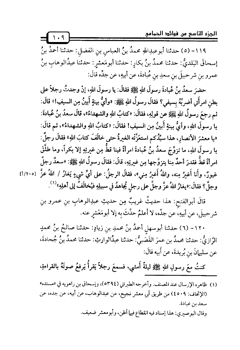 119 - (5) حدثنا أبوعبدِاللهِ محمدُ بنُ العباسِ بنِ الفضلِ: حدثنا أحمدُ بنُ إسحاقَ البَلديُّ: حدثنا محمدُ بنُ بكارٍ: حدثنا أبومَعشرٍ: حدثنا عبدُالوهابِ بنُ عمرو بنِ شرحبيلَ بنِ سعدِ بنِ عُبادةَ، عن أبيهِ، عن جدِّه قالَ: