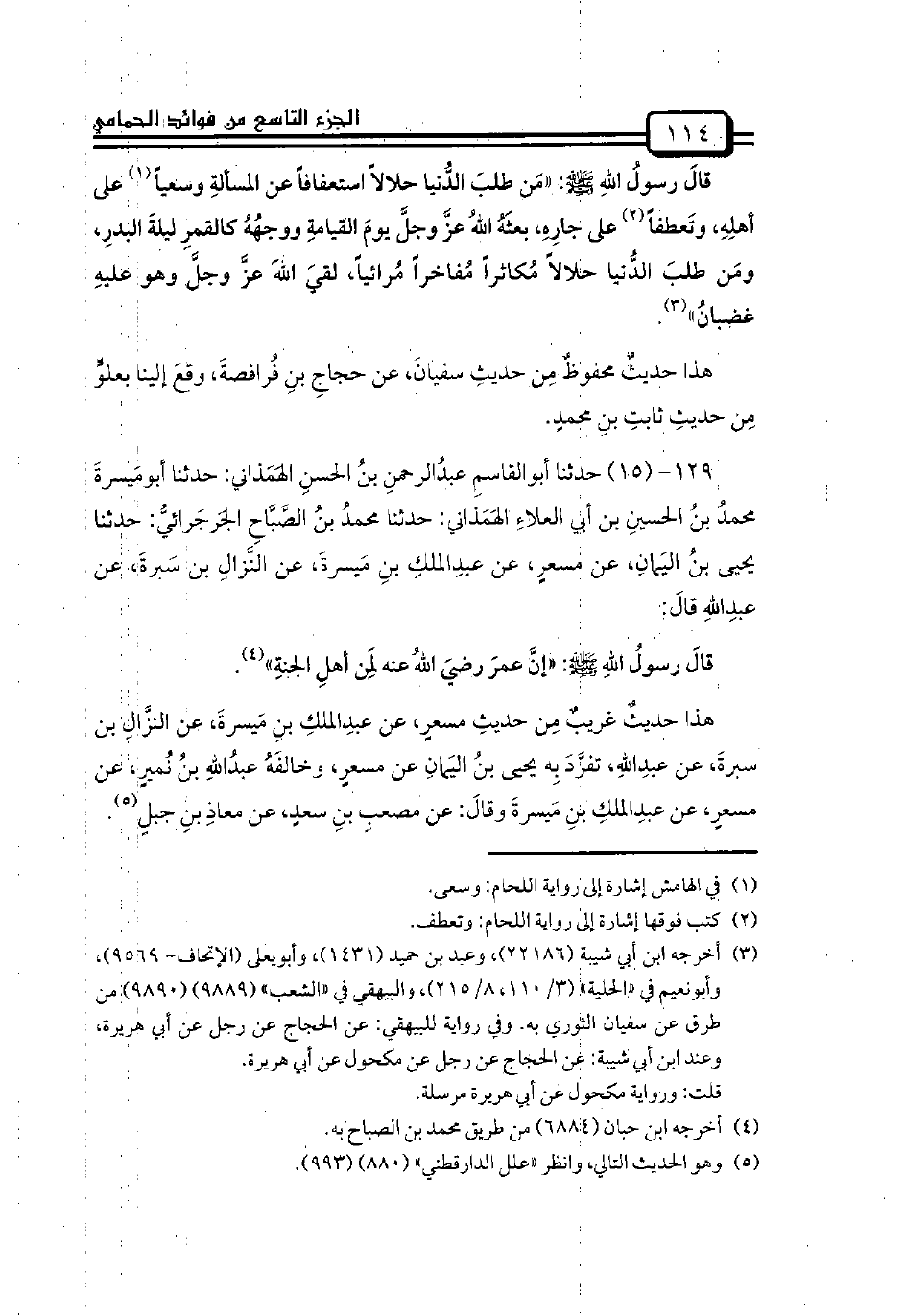 129 - (15) حدثنا أبوالقاسمِ عبدُالرحمنِ بنُ الحسنِ الهَمَذاني: حدثنا أبومَيسرةَ محمدُ بنُ الحسينِ بن أبي العلاءِ الهَمَذاني: حدثنا محمدُ بنُ الصَّبَّاحِ الجَرجَرائيُّ: حدثنا يحيى بنُ اليَمانِ، عن مسعرٍ، عن عبدِالملكِ بنِ مَيسرةَ، عن النَّزالِ بن سَبرةَ، عن عبدِاللهِ قالَ: