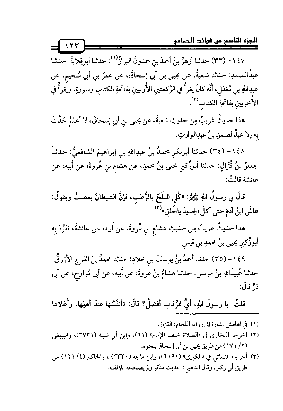 148 - (34) حدثنا أبوبكرٍ محمدُ بنُ عبدِاللهِ بنِ إبراهيمَ الشافعيُّ: حدثنا جعفرُ بنُ كُزَالٍ: حدثنا أبوزُكيرٍ يحيى بنُ محمدٍ، عن هشامِ بنِ عُروةَ، عن أَبيه، عن عائشةَ قالتْ: