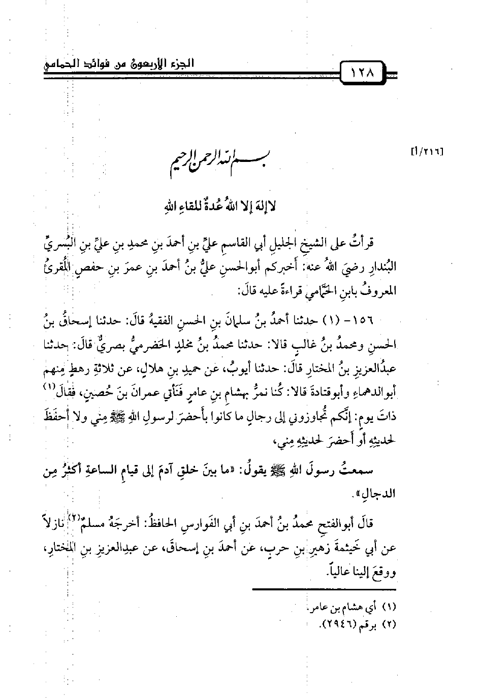 156 - (1) حدثنا أحمدُ بنُ سلمانَ بنِ الحسنِ الفقيهُ قالَ: حدثنا إسحاقُ بنُ الحسنِ ومحمدُ بنُ غالبٍ قالا: حدثنا محمدُ بنُ مخلدٍ الحَضرميُّ بصريٌّ قالَ: حدثنا عبدُالعزيزِ بنُ المختارِ قالَ: حدثنا أيوبُ، عن حميدِ بنِ هلالٍ، عن ثلاثةِ رهطٍ مِنهم أبوالدهماءِ وأبوقتادةَ قالا: كُنا نمرُّ بهشامِ بنِ عامرٍ فَنَأتي عمرانَ بنَ حُصينٍ، فقالَ ذاتَ يومٍ: إنَّكم تُجاوزوني إلى رجالٍ ما كانوا بأَحضرَ لرسولِ اللهِ صلى الله عليه وسلم مِني ولا أحفَظَ لحديثِهِ أو أَحضرَ لحديثِهِ مِني،