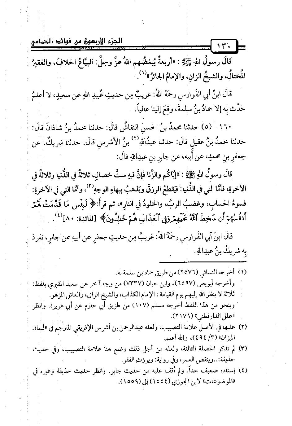 160 - (5) حدثنا محمدُ بنُ الحسنِ النقاشُ قالَ: حدثنا محمدُ بنُ شاذانَ قالَ: حدثنا محمدُ بنُ عقيلٍ قالَ: حدثنا عبدُاللهِ بنُ الأشرسِ قالَ: حدثنا شريكٌ، عن جعفرِ بنِ محمدٍ، عن أَبيه، عن جابرِ بنِ عبدِاللهِ قالَ: