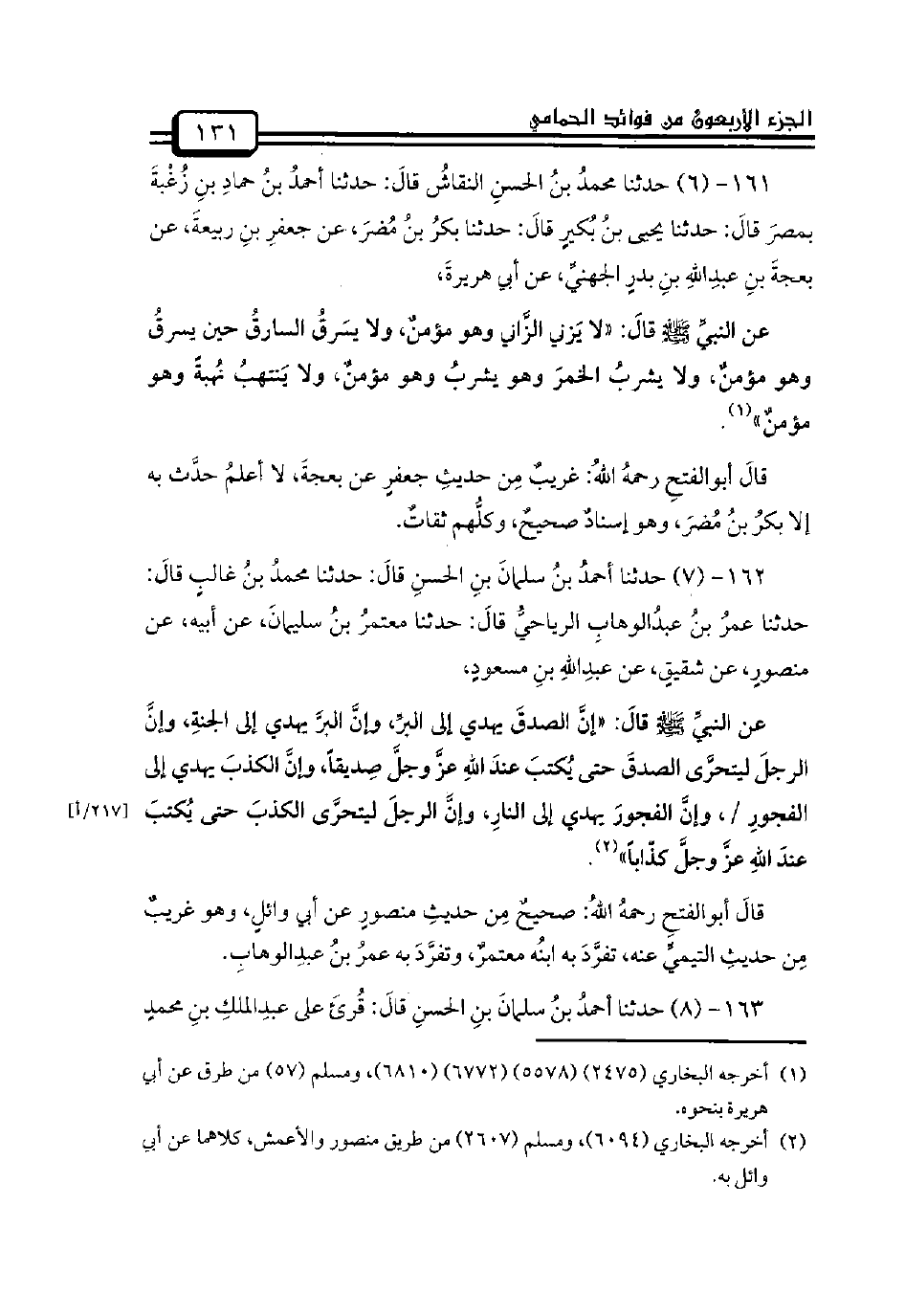 161 - (6) حدثنا محمدُ بنُ الحسنِ النقاشُ قالَ: حدثنا أحمدُ بنُ حمادِ بنِ زُغْبةَ بمصرَ قالَ: حدثنا يحيى بنُ بُكيرٍ قالَ: حدثنا بكرُ بنُ مُضرَ، عن جعفرِ بنِ ربيعةَ، عن بعجةَ بنِ عبدِاللهِ بنِ بدرٍ الجهنيِّ، عن أبي هريرةَ،