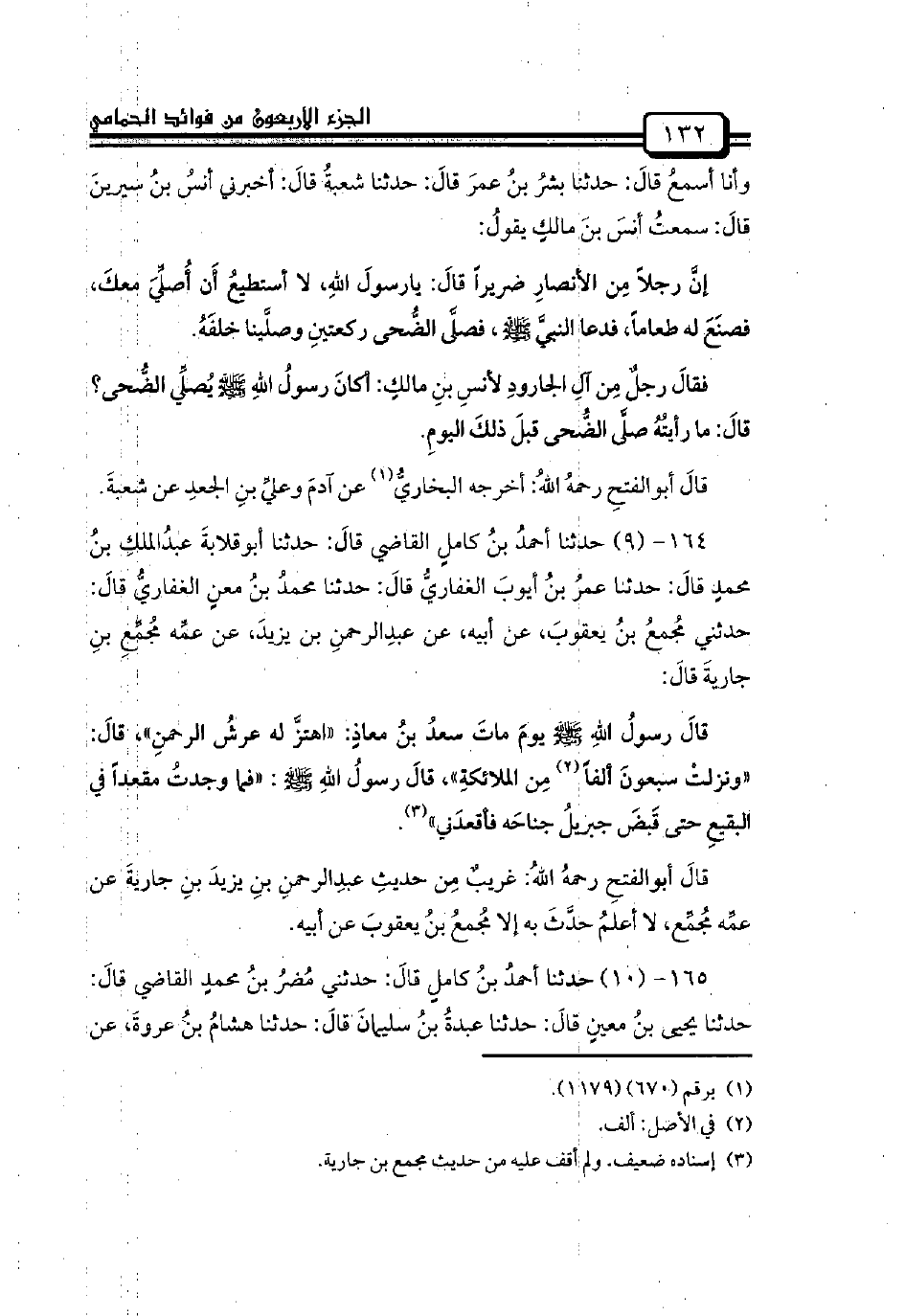164 - (9) حدثنا أحمدُ بنُ كاملٍ القاضي قالَ: حدثنا أبوقلابةَ عبدُالملكِ بنُ محمدٍ قالَ: حدثنا عمرُ بنُ أيوبَ الغفاريُّ قالَ: حدثنا محمدُ بنُ معنٍ الغفاريُّ قالَ: حدثني مُجمعُ بنُ يعقوبَ، عن أبيه، عن عبدِالرحمنِ بن يزيدَ، عن عمِّه مُجمِّعِ بنِ جاريةَ قالَ: