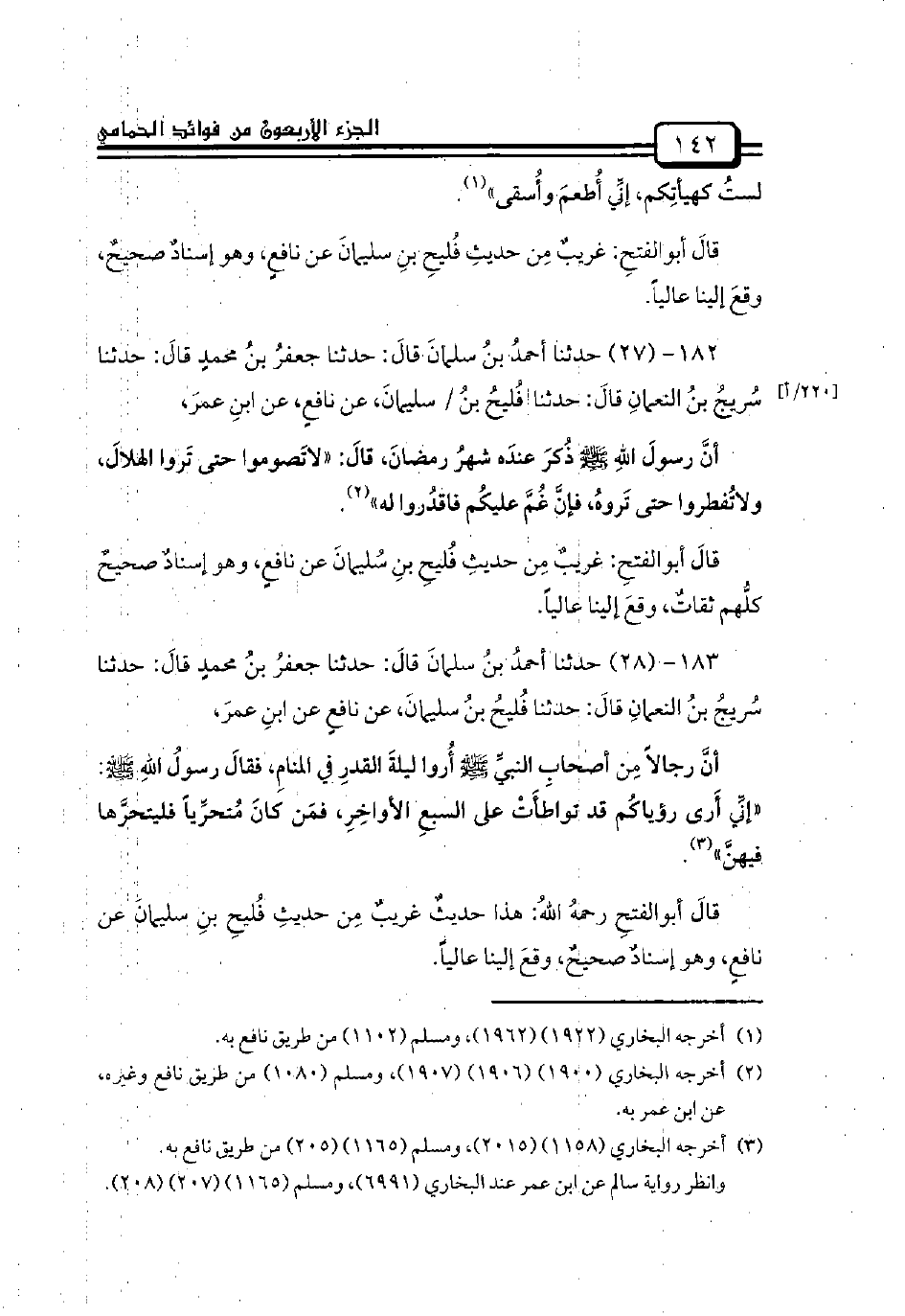 182 - (27) حدثنا أحمدُ بنُ سلمانَ قالَ: حدثنا جعفرُ بنُ محمدٍ قالَ: حدثنا سُريجُ بنُ النعمانِ قالَ: حدثنا فُليحُ بنُ / سليمانَ، عن نافعٍ، عن ابنِ عمرَ،