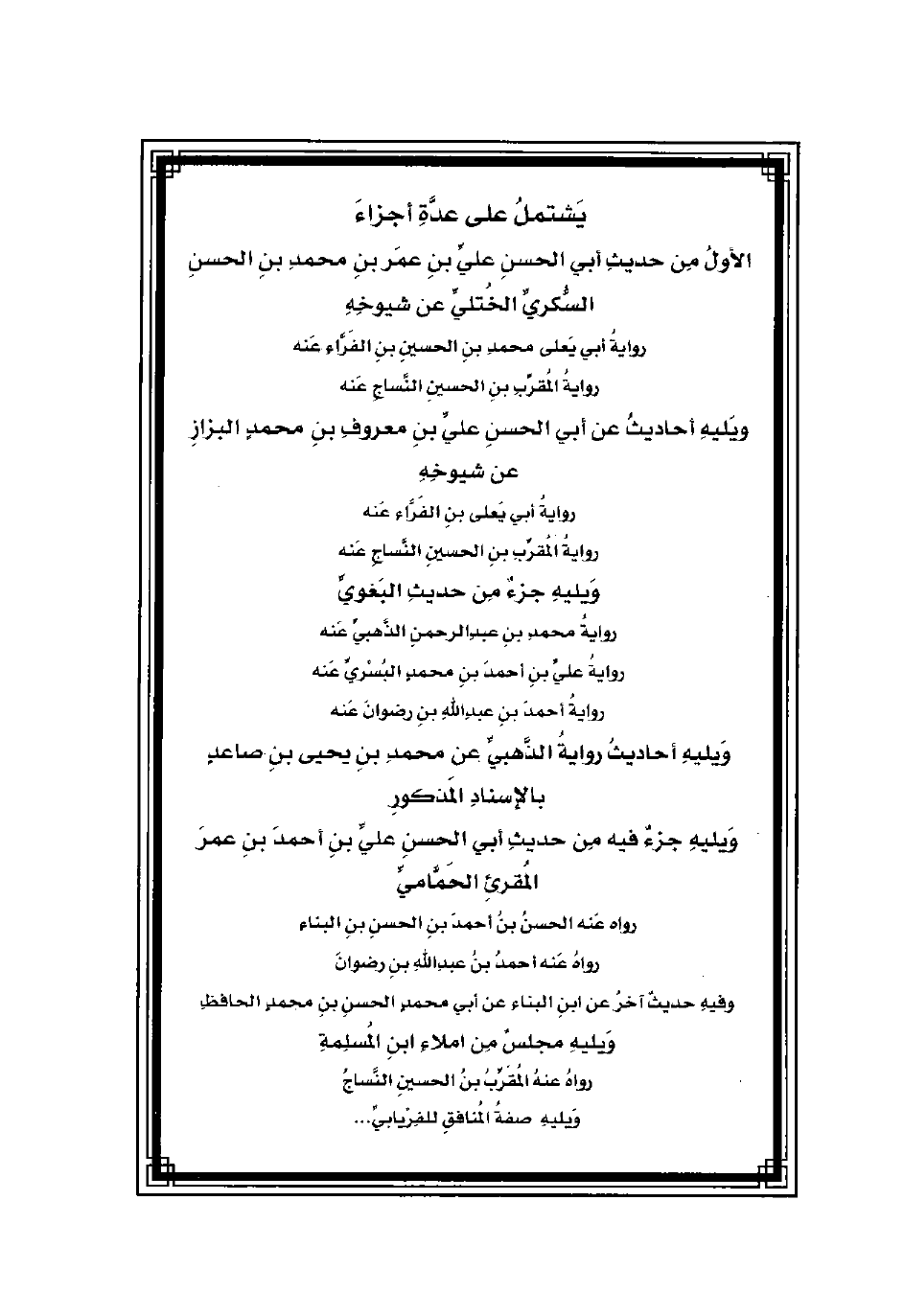 الأولُ مِن حديثِ أبي الحسنِ عليِّ بنِ عمَر بنِ محمدِ بنِ الحسنِ السُّكريِّ الخُتليِّ عن شيوخِهِ