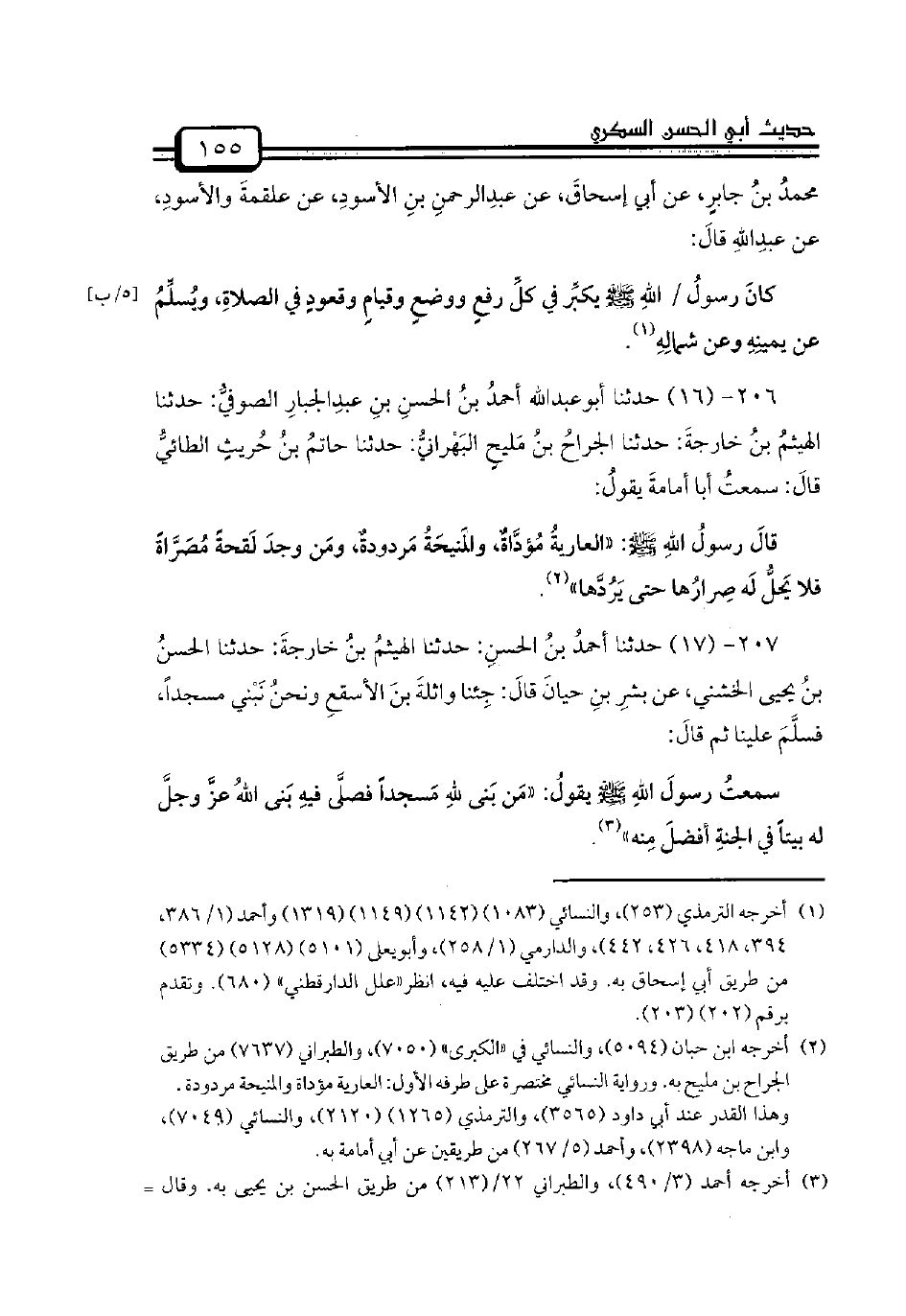 207 - (17) حدثنا أحمدُ بنُ الحسنِ: حدثنا الهيثمُ بنُ خارجةَ: حدثنا الحسنُ بنُ يحيى الخشني، عن بشرِ بنِ حيانَ قالَ: جِئنا واثلةَ بنَ الأسقعِ ونحنُ نَبْني مسجداً، فسلَّمَ علينا ثم قالَ: