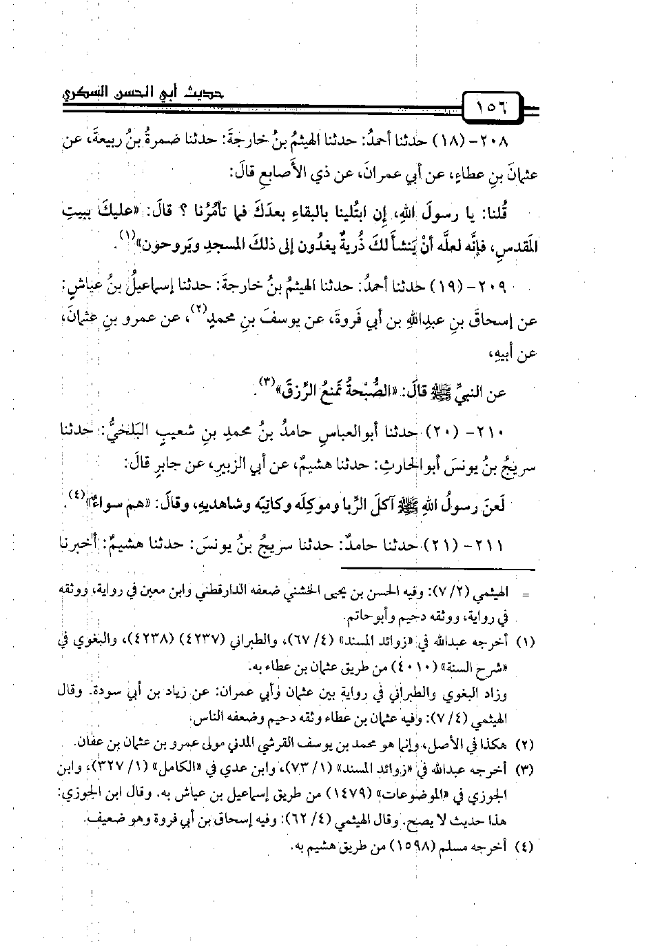 209 - (19) حدثنا أحمدُ: حدثنا الهيثمُ بنُ خارجةَ: حدثنا إسماعيلُ بنُ عياشٍ: عن إسحاقَ بنِ عبدِاللهِ بن أبي فَروةَ، عن يوسفَ بنِ محمدٍ، عن عمرو بنِ عثمانَ، عن أبيهِ،