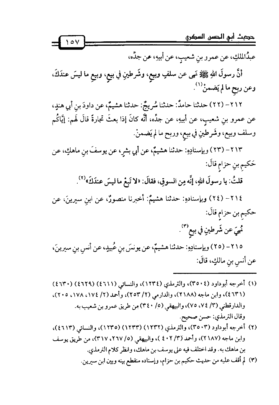 212 - (22) حدثنا حامدٌ: حدثنا سُريجٌ: حدثنا هشيمٌ، عن داودَ بنِ أبي هندٍ، عن عمرو بنِ شعيبٍ، عن أبيهِ، عن جدِّه، أنَّه كانَ إذا بعثَ تجارةً قالَ لَهم: إيَّاكُم وسلف وبيع، وشَرطينِ في بيعٍ، وربح ما لم يَضمنْ.