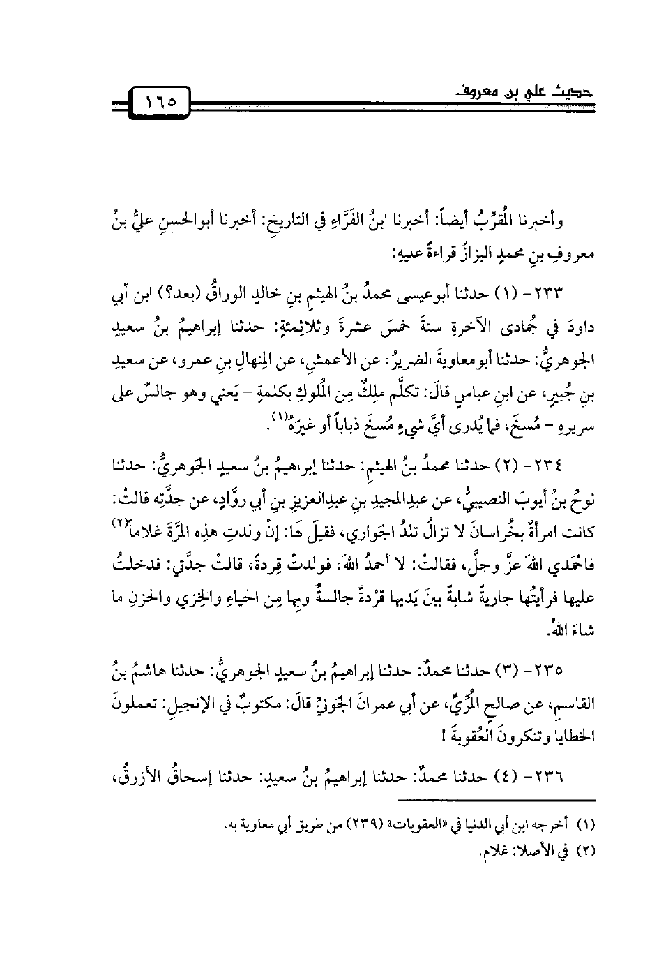 234 - (2) حدثنا محمدُ بنُ الهيثمِ: حدثنا إبراهيمُ بنُ سعيدٍ الجَوهريُّ: حدثنا نوحُ بنُ أيوبَ النصيبيُّ، عن عبدِالمجيدِ بنِ عبدِالعزيزِ بنِ أبي روَّادٍ، عن جدَّتِه قالتْ: كانت امرأةٌ بخُراسانَ لا تزالُ تلدُ الجَواري، فقيلَ لَها: إنْ ولدتِ هذِه المرَّةَ غلاماً فاحْمَدي اللهَ عزَّ وجلَّ، فقالتْ: لا أحمدُ اللهَ، فولدتْ قِردةً، قالتْ جدَّتي: فدخلتُ عليها فرأيتُها جاريةً شابةً بينَ يَديها قرْدةٌ جالسةٌ وبِها مِن الحياءِ والخِزي والحزنِ ما شاءَ اللهُ.