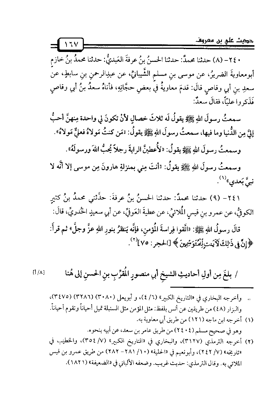 240 - (8) حدثنا محمدٌ: حدثنا الحسنُ بنُ عرفةَ العَبديُّ: حدثنا محمدُ بنُ خازمٍ أبومعاويةَ الضريرُ، عن موسى بنِ مسلمٍ الشَّيبانيِّ، عن عبدِالرحمنِ بنِ سابطٍ، عن سعدِ بنِ أبي وقاصٍ قالَ: قدمَ معاويةُ في بعضِ حجَّاتِهِ، فأتاهُ سعدُ بنُ أبي وقاصٍ فَذَكروا عليّاً، فقالَ سعدٌ: