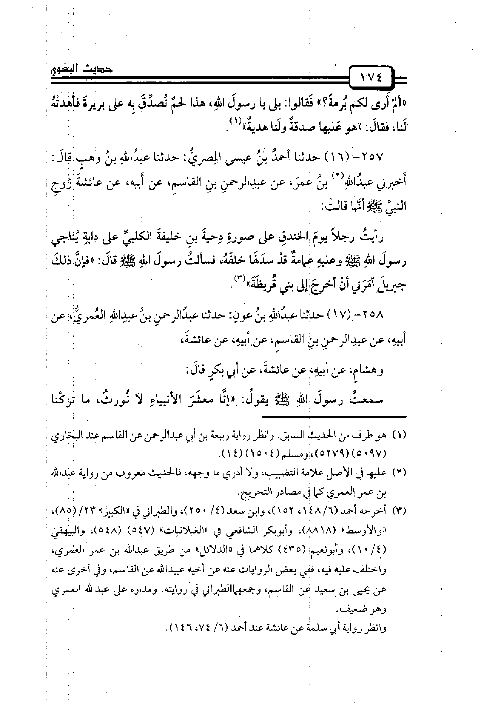 258 - (17) حدثنا عبدُاللهِ بنُ عونٍ: حدثنا عبدُالرحمنِ بنُ عبدِاللهِ العُمريُّ، عن أبيهِ، عن عبدِالرحمنِ بنِ القاسمِ، عن أبيهِ، عن عائشةَ،
