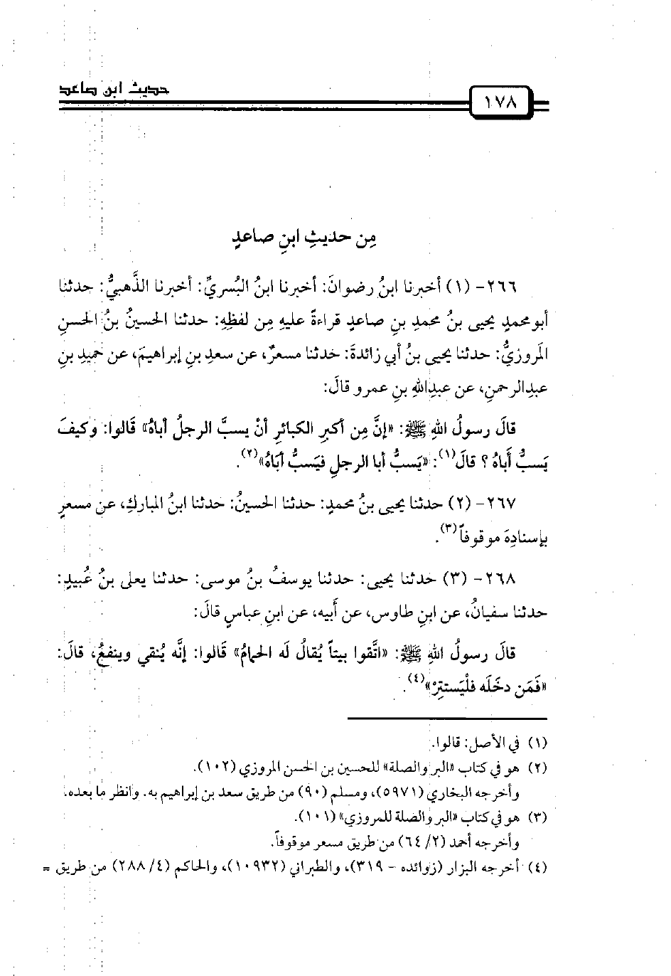 266 - (1) أخبرنا ابنُ رضوانَ: أخبرنا ابنُ البُسريِّ: أخبرنا الذَّهبيُّ: حدثنا أبومحمدٍ يحيى بنُ محمدِ بنِ صاعدٍ قراءةً عليهِ مِن لفظِهِ: حدثنا الحسينُ بنُ الحسنِ المَروزيُّ: حدثنا يحيى بنُ أبي زائدةَ: حدثنا مسعرٌ، عن سعدِ بنِ إبراهيمَ، عن حميدِ بنِ عبدِالرحمنِ، عن عبدِاللهِ بنِ عمرو قالَ: