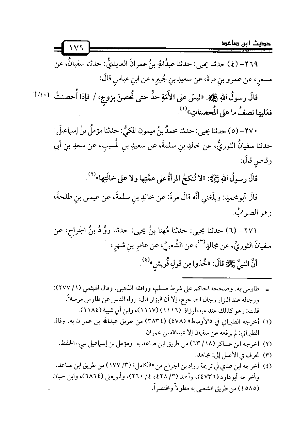 271 - (6) حدثنا يحيى: حدثنا مُهنا بنُ يحيى: حدثنا روَّادُ بنُ الجراحِ، عن سفيانَ الثوريِّ، عن مجالدٍ، عن الشَّعبيِّ، عن عامرِ بنِ شهرٍ،