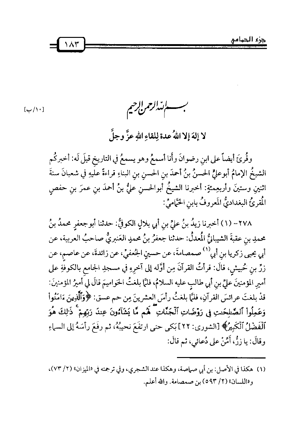 278 - (1) أخبرنا زيدُ بنُ عليِّ بنِ أبي بلالٍ الكوفيُّ: حدثنا أبوجعفرٍ محمدُ بنُ محمدِ بنِ عقبةَ الشيبانيُّ المُعدلُ: حدثنا جعفرُ بنُ محمدٍ العَنبريُّ صاحبُ العربية، عن أبي يحيى زكريا بنِ أبي صمصامةَ، عن حسينٍ الجُعفيِّ، عن زائدةَ، عن عاصمٍ، عن زرِّ بنِ حُبيشٍ، قالَ: قرأتُ القرآنَ مِن أوَّله إلى آخرِهِ في مسجدِ الجامعِ بالكوفةِ على أميرِ المؤمنينَ عليِّ بنِ أبي طالبٍ عليه السلامُ، فلمَّا بلغتُ الحَواميمَ قالَ لي أميرُ المؤمنينَ: قدْ بلغتَ عرائسَ القرآنِ، فلمَّا بلغتُ رأسَ العشرينَ مِن حم عسق: {وَالَّذِينَ آمَنُوا وَعَمِلُوا الصَّالِحَاتِ فِي رَوْضَاتِ الْجَنَّاتِ لَهُمْ مَا يَشَاءُونَ عِنْدَ رَبِّهِمْ ذَلِكَ هُوَ الْفَضْلُ الْكَبِيرُ} [الشورى: 22] بَكى حتى ارتفَعَ نحيبُهُ، ثم رفَعَ رأسَهُ إلى السماءِ وقالَ: يا زرُّ، أَمِّنْ على دُعائي، ثم قالَ: