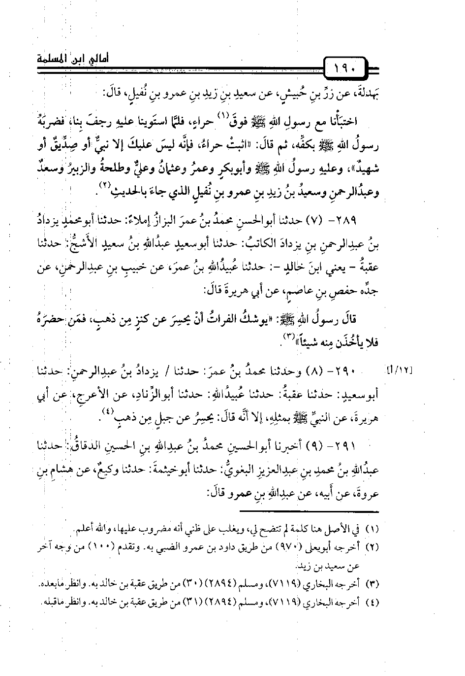 291 - (9) أخبرنا أبوالحسينِ محمدُ بنُ عبدِاللهِ بنِ الحسينِ الدقاقُ: حدثنا عبدُاللهِ بنُ محمدِ بنِ عبدِالعزيزِ البغويُّ: حدثنا أبوخيثمةَ: حدثنا وكيعٌ، عن هشامِ بنِ عروةَ، عن أَبيه، عن عبدِاللهِ بنِ عمرو قالَ:
