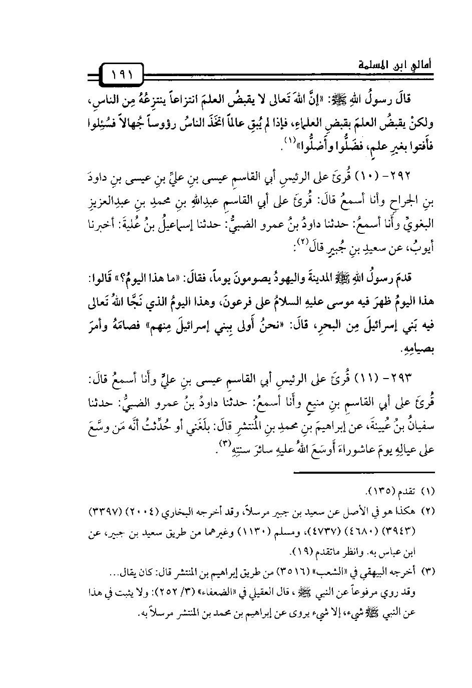 293 - (11) قُرئَ على الرئيسِ أبي القاسمِ عيسى بنِ عليٍّ وأَنا أسمعُ قالَ: قُرئَ على أبي القاسمِ بنِ منيعٍ وأَنا أسمعُ: حدثنا داودُ بنُ عمرو الضبيُّ: حدثنا سفيانُ بنُ عُيينةَ، عن إبراهيمَ بنِ محمدِ بنِ المُنتشرِ قالَ: بلَغَني أو حُدِّثتُ أنَّه مَن وسَّعَ على عيالِهِ يومَ عاشوراءَ أَوسَعَ اللهُ عليهِ سائرَ سنتِهِ.