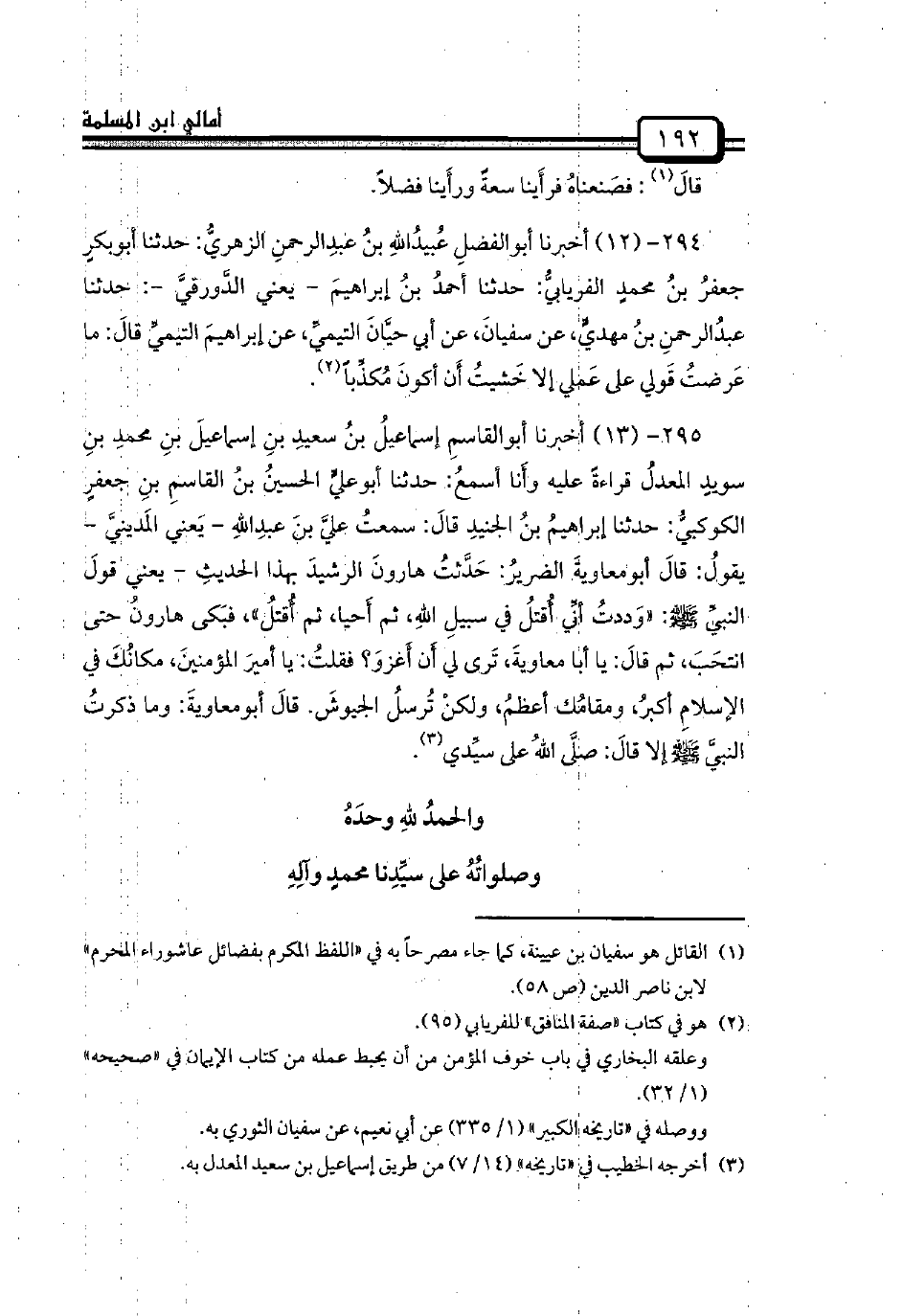 295 - (13) أخبرنا أبوالقاسمِ إسماعيلُ بنُ سعيدِ بنِ إسماعيلَ بنِ محمدِ بنِ سويدٍ المعدلُ قراءةً عليه وأَنا أسمعُ: حدثنا أبوعليٍّ الحسينُ بنُ القاسمِ بنِ جعفرٍ الكوكبيُّ: حدثنا إبراهيمُ بنُ الجنيدِ قالَ: سمعتُ عليَّ بنَ عبدِاللهِ - يَعني المَدينيَّ - يقولُ: قالَ أبومعاويةَ الضريرُ: حَدَّثتُ هارونَ الرشيدَ بهذا الحديثِ - يعني قولَ النبيِّ صلى الله عليه وسلم: «وَددتُ أنِّي أُقتلُ في سبيلِ اللهِ، ثم أَحيا، ثم أُقتلُ»، فبَكى هارونُ حتى انتحَبَ، ثم قالَ: يا أبا معاويةَ، تَرى لي أَن أَغزوَ؟ فقلتُ: يا أميرَ المؤمنينَ، مكانُكَ في الإسلامِ أكبرُ، ومقامُك أعظمُ، ولكنْ تُرسلُ الجيوشَ. قالَ أبومعاويةَ: وما ذكرتُ النبيَّ صلى الله عليه وسلم إلا قالَ: صلَّى اللهُ على سيِّدي.
