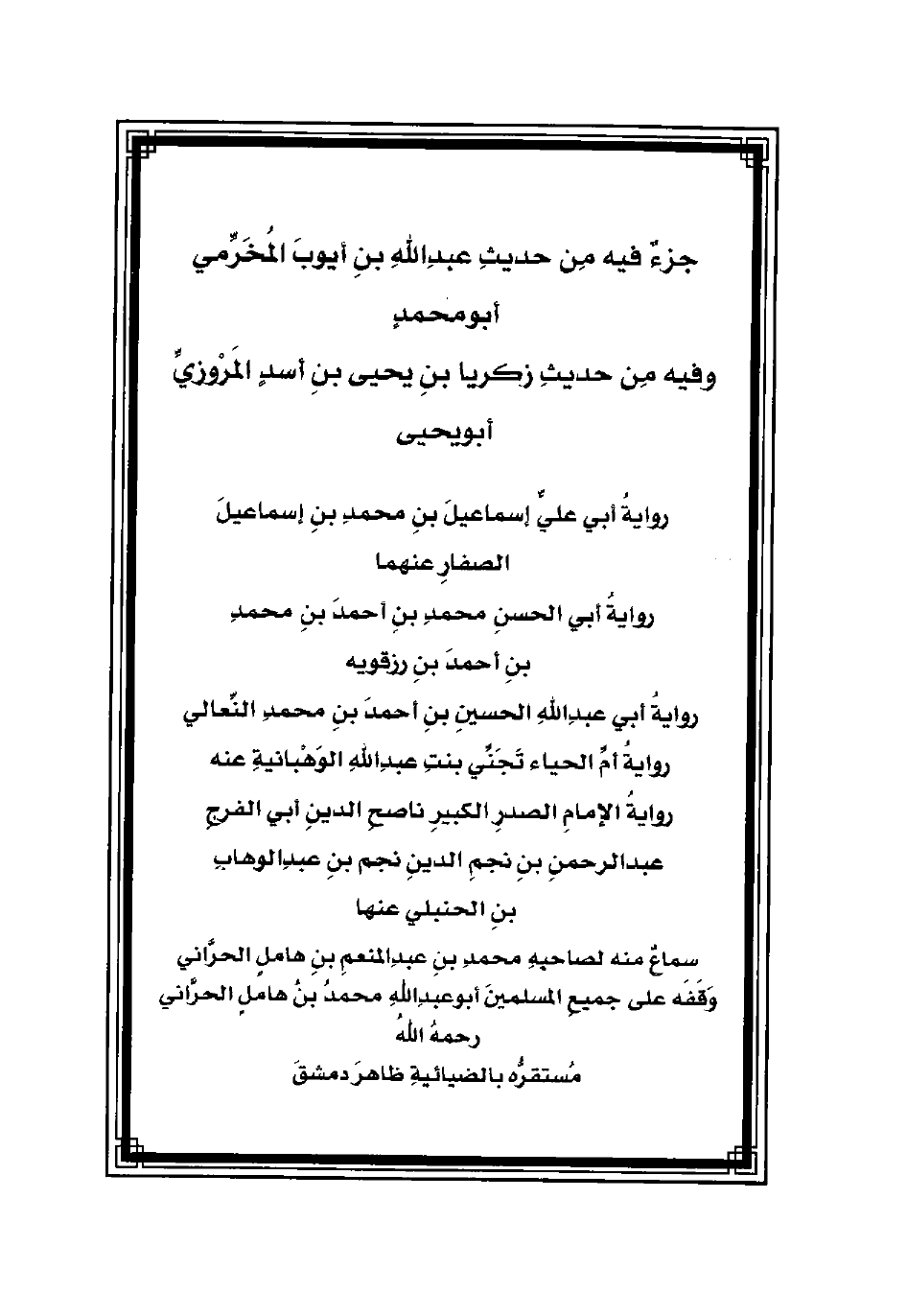 جزءٌ فيه مِن حديثِ عبدِاللهِ بنِ أيوبَ المُخَرِّمي أبومحمدٍ وفيه مِن حديثِ زكريا بنِ يحيى بنِ أسدٍ المَرْوزيِّ أبويحيى