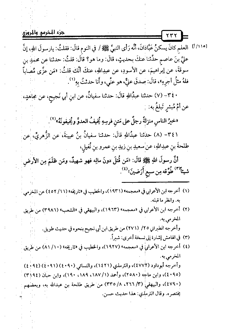 أنَّ رسولَ اللهِ صلى الله عليه وسلم قالَ: «مَن قُتلَ دونَ مالِه فهو شهيدٌ، ومَن ظلَمَ مِن الأرضِ شيئاً طُوِّقه مِن سبعِ أَرَضينَ».